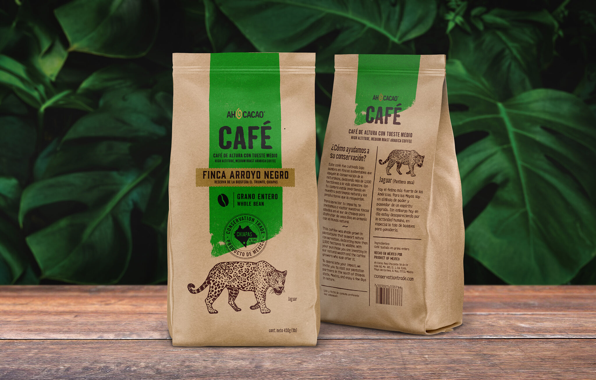 This range of ground and unground coffee beans for the Mexican café chain Ah Cacao is sourced from local plantations in the southern Mexican state of Chiapas. Its aim is to support the conservation of Mexican wildlife and habitats by sourcing only from plantations where the coffee is sustainably shade-grown, conserving the wildlife habitat. This initial range is from the high-altitude Arroyo Negro plantation which includes a 1,500-hectare nature reserve.