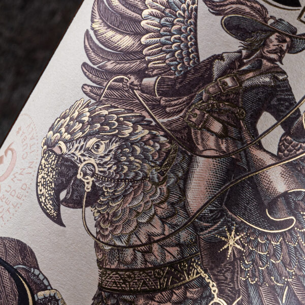 The centerpiece of the label is an intricate illustration that tells a fairy tale about a parrot and a pirate. The illustration is beautifully crafted with detailed strokes, sharp lines, and an eye for detail that captures the essence of the story. The use of gold foil and voluminous varnishes adds depth and texture to the illustration, making it more captivating.