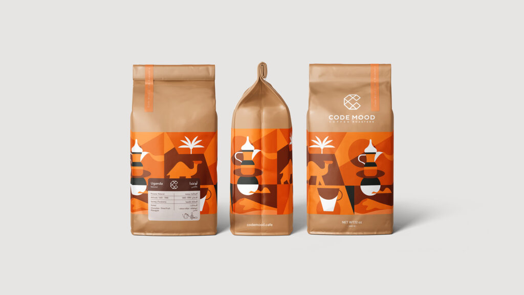 “A new design project for Code Mood, a premium coffee roastery based in KSA, tasked me with creating a packaging that conveys the unique characteristics and flavors of their coffee blends.