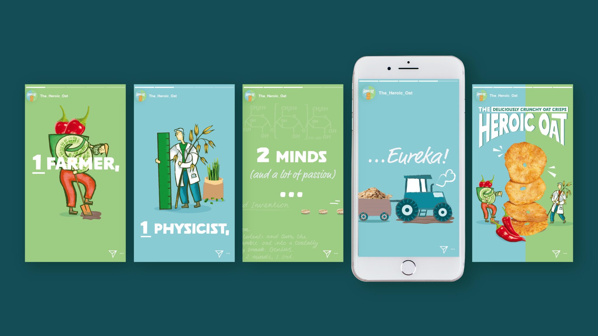 After a creative name generation process, the name “The Heroic Oat” was chosen. The brand is positioned around the idea of ‘tasty honest goodness’ – in a category where there is a lot of confusion, a lack of depth of nutritional information coupled with self-deception of trying to be healthy yet wanting satisfaction of a tasty reward. We sought to strike a balance between the element of honest goodness, in knowing you are doing yourself some good, whilst at the same time being rewarded with great flavours. The brand design heroes the playfulness and realness of the brand story – two men and an oat, and what they have created together.