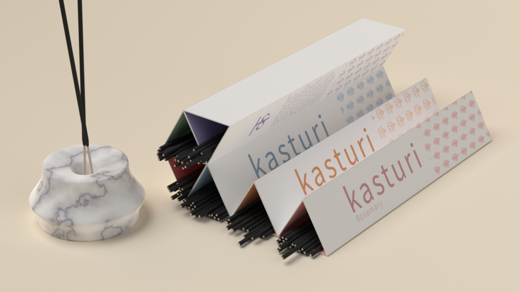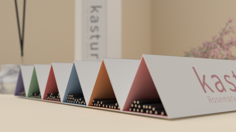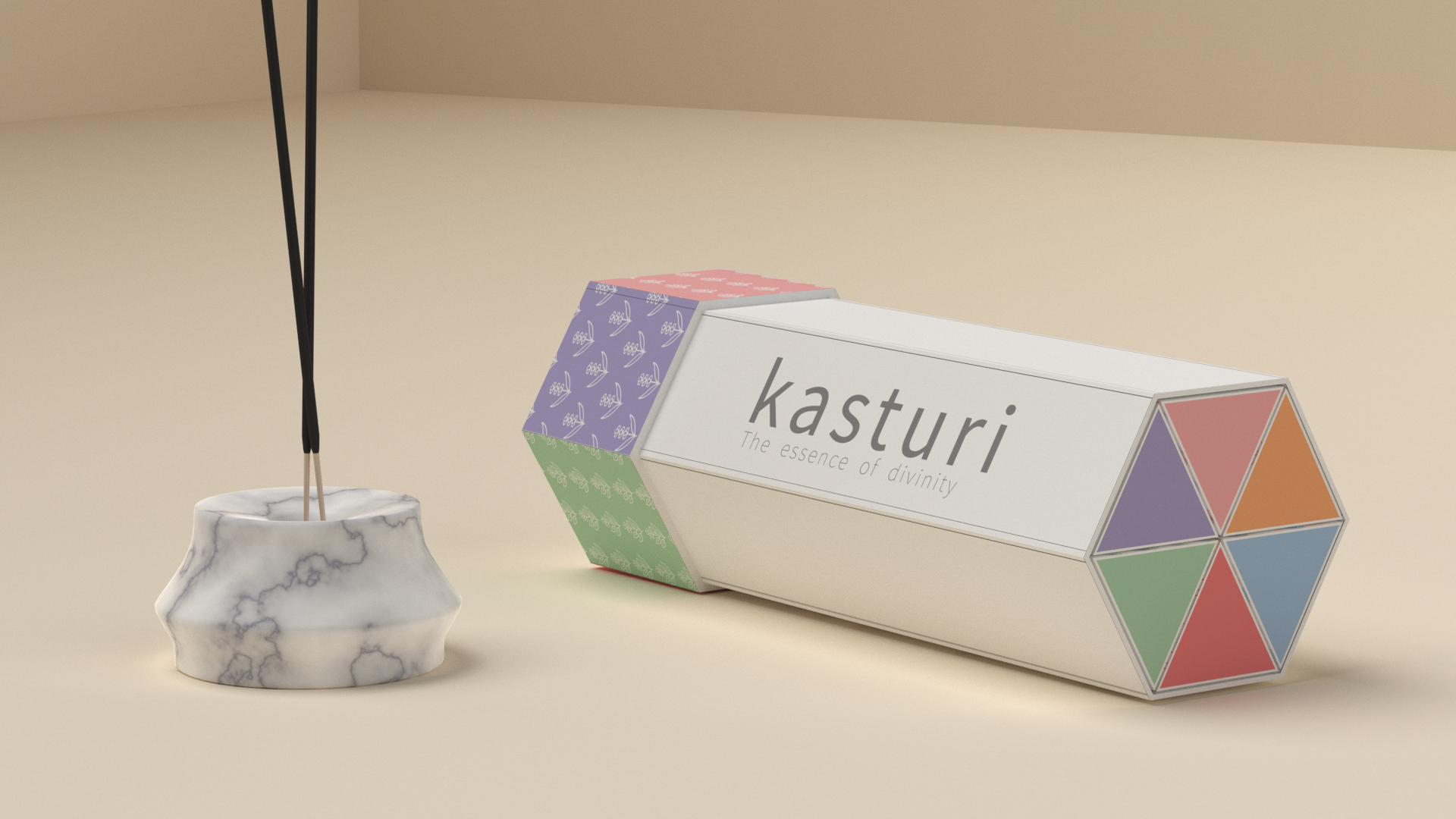 Kasturi Incense Sticks packaging tackles the challenge by constructing a hexagonal cylindrical form with six triangular prisms on each side of the hexagon. It comprises six different fragrances that can be secured by a flexible opening and closing. The package can carry 180 sticks (30 in each triangular prism).