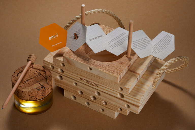 This self-promotion project was thought to work as an alert and a representation of the importance of the circle of life. Our Bee Om Hotels network will create a perfect and safe habitat for bees around the world. We selected all the materials based on the idea of the 3 “R”: reused wood, reusable jar and spoon-shaped pencil, and reduced production processes. As Albert Einstein is thought to have said, “If the bee disappears from the surface of the earth, man would have no more than four years to live”. True pollination shelters, the bee hotels play a key role in sustainability, so they are a safe place for winter hibernation/summer reproduction and, thus, a guarantee of our balance and continuity.