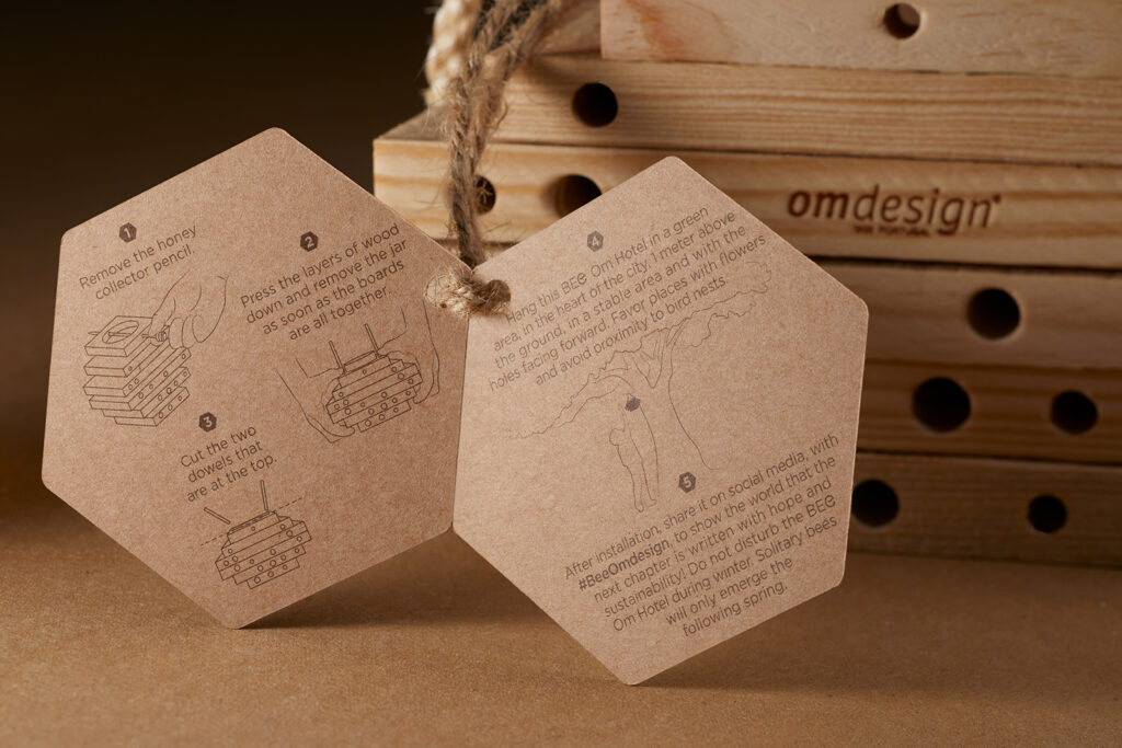 Omdesign also used virgin raw materials to avoid a negative impact on the environment. To start installing OMel, firstly we need to remove the honey collector pencil, then press the layers of wood down and remove the jar as soon as the boards are all together. Then, we cut the two dowels that are at the top and hang this bee hotel in a green area, in the heart of the city, 1mt above the ground, in a stable area, and with the holes facing forward. We also should favor places with flowers and avoid proximity to bird nests, to keep bees safe. After the installation in Nature, we cannot disturb the bee hotel during winter, since the solitary bees will only emerge the following spring. Hopefully, this will show the world that the next chapter is written with hope and sustainability!