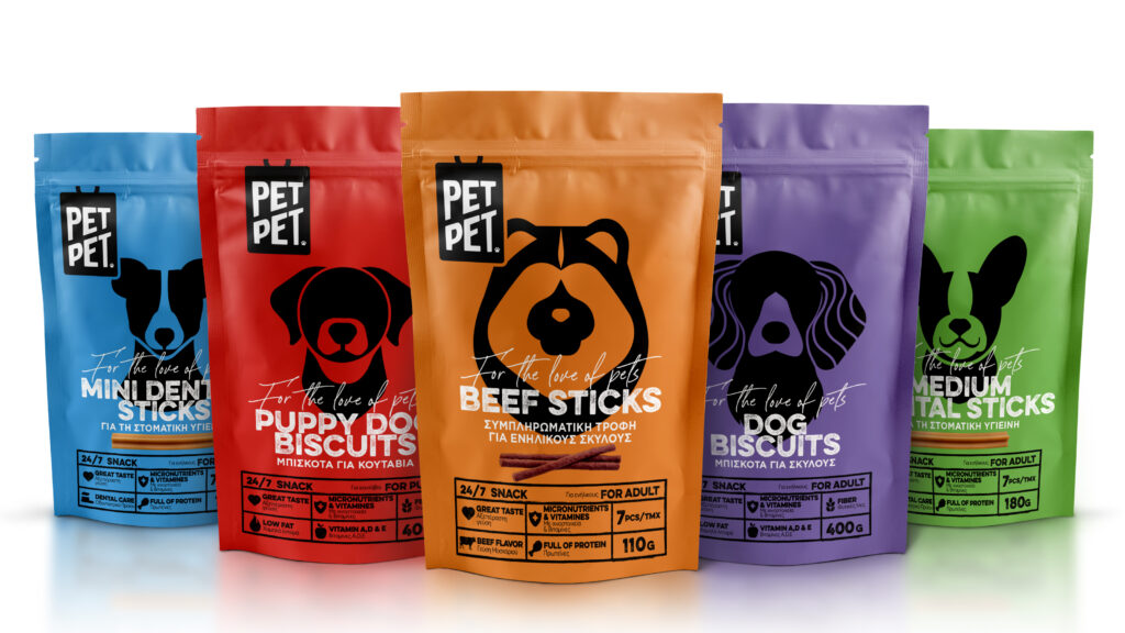 The packaging is designed with vibrant, eye-catching colours that convey a strong message, combined with simple graphics reminiscent of infographics. The linear illustrations of dogs add another unique element to the packaging.