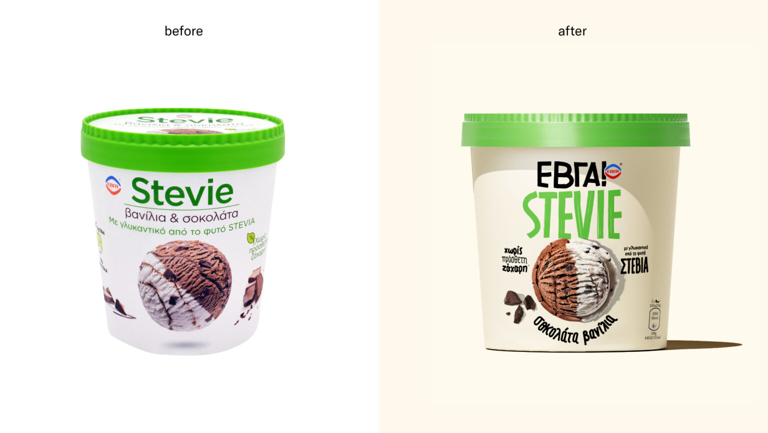 Unilever asked us to redesign the packaging of a rather technical SKU – ice cream with Stevia sweetener instead of sugar- and try to reignite the friendly and natural vibes that made people love the brand in the first place. Our design approach was to create a visual & emotional shortcut to the brand’s origins back in the 1930s and elevate its values of innocence, unpretentiousness, and craftsmanship. We kept food styling simple yet mouthwatering, giving out honest-to-goodness vibes.