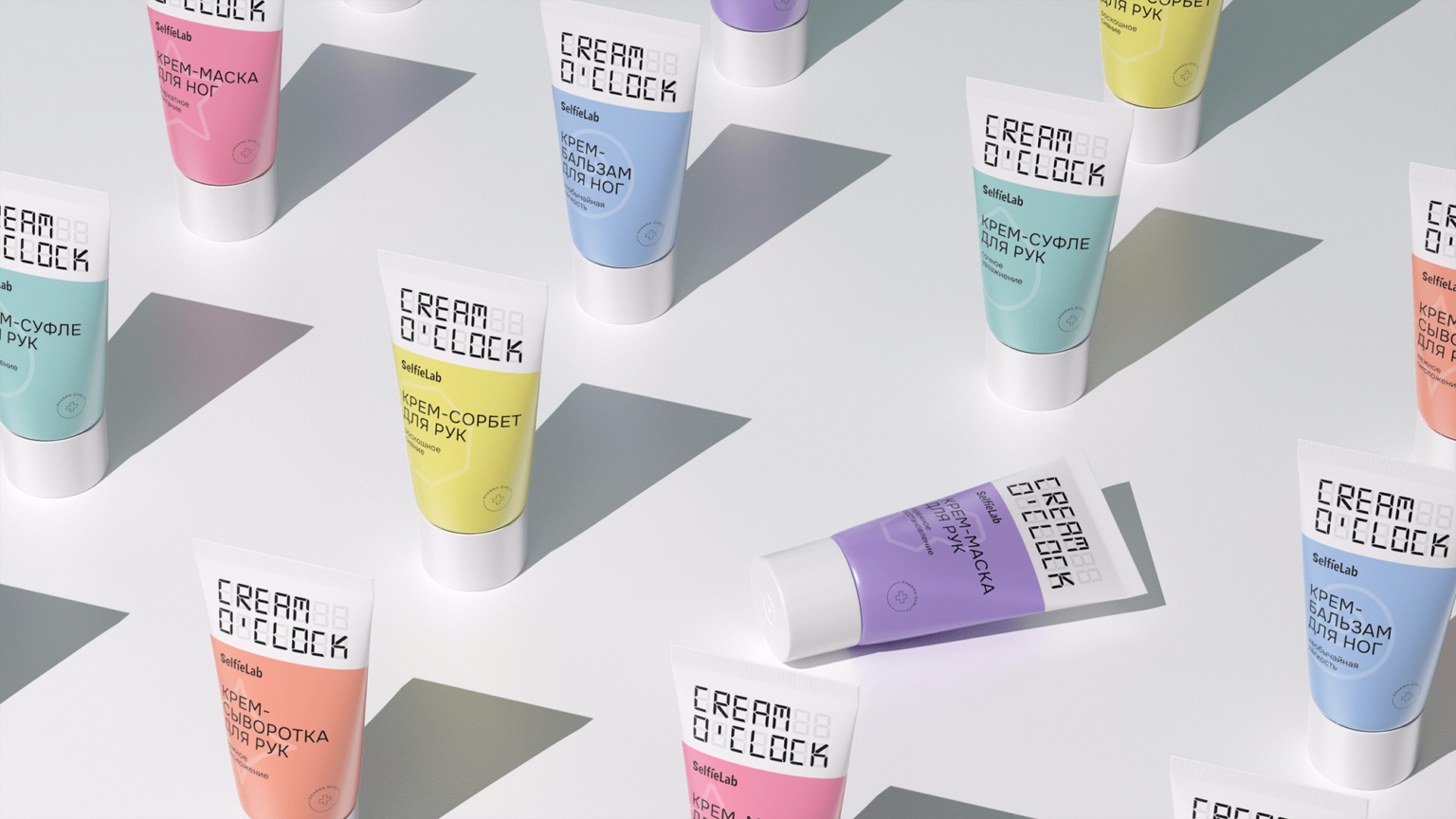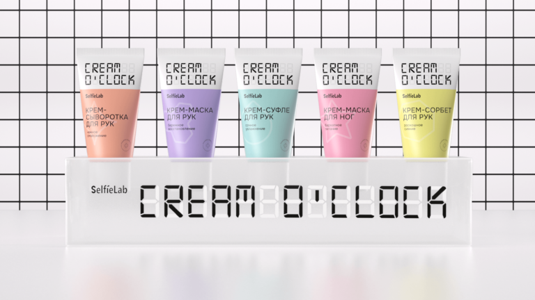 To emphasize the importance of a beauty break, we came up with the product name Cream O’clock. It alludes to the metaphor of an electronic clock. Everyone has encountered them in their life, and on the subconscious level, the image is clear to everyone. Based on this idea, we chose a simple visual language for the product. The upper part contains a white heading with the brand name alluding to the metaphor of an electronic clock.