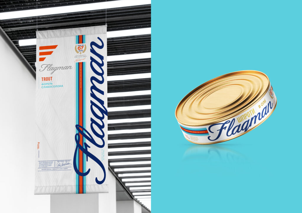 The iconic F-shaped logo was reimagined, simplified, and moved to the category of additional design elements. The main logo became the stylized handwritten font of “Flagman,” which is intended to be used together with stylized stripes. The colors of the stripes resemble the combination of flags of several European countries since a significant portion of the products is exported from there. And to add volume to the graphics, the signature white background was supplemented with a pattern of thin graphic lines resembling sea waves.