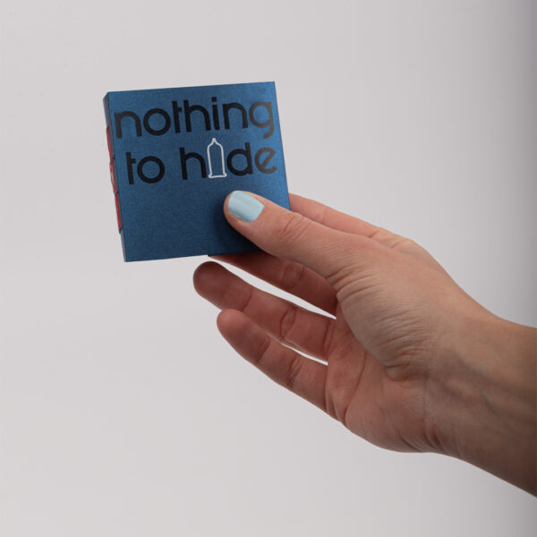 The whole idea of this style was to create something cool and brave. Sex is an intimate thing, and too harsh or offensive messages and illustrations were avoided on purpose, but letting people bravely buy condom packaging and start a discussion was a goal. Furthermore, nothing to hide is way more functional than the currently available packagings in the market.