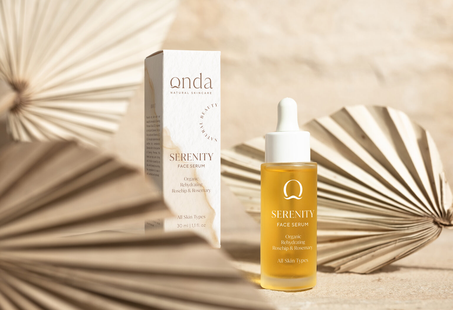 The brand name Onda – the Spanish word for wave – plays a leading role in the overall design and packaging. Water, as the most primal and essential element, stands for naturalness, youth and beauty. The logo consists of classic, elegant lettering. A wave is integrated into the letter O of the word Onda, which functions as a stand-alone monogram and is used as a branding element in appropriate places. A light-painted watercolor background, reminiscent of waves washing up on the beach, completes the look. Natural color shades further highlight the brand message and the naturalness of the product.