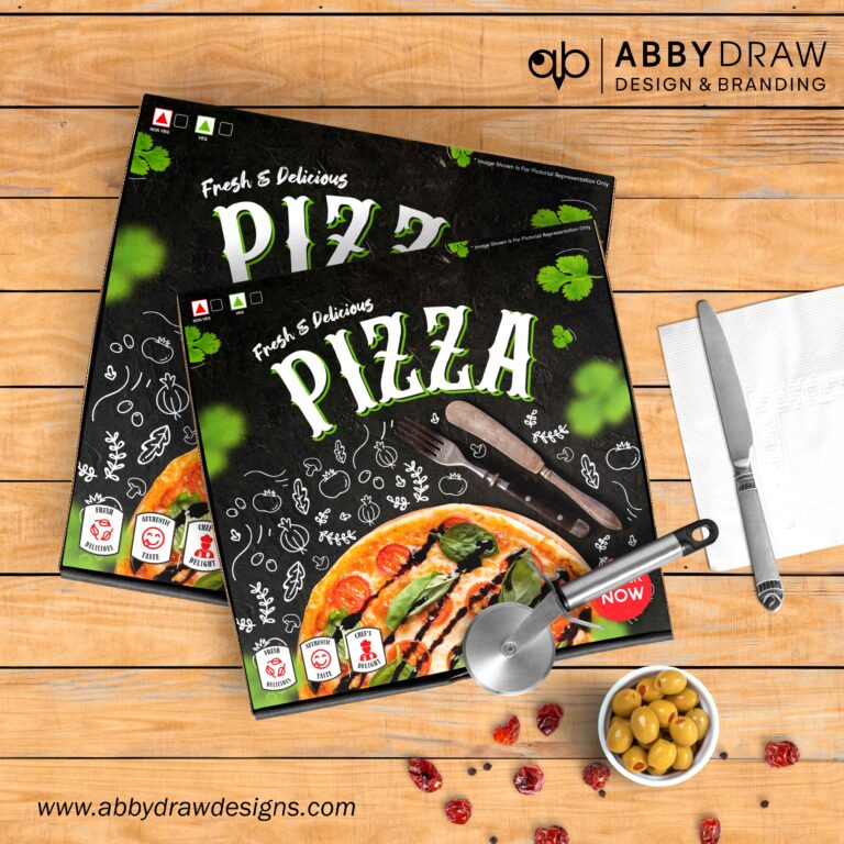 The overall design features a vibrant and appetizing color palette, incorporating bold shades of red, orange, or green to evoke a sense of excitement and appetite appeal. These colors are carefully selected to reflect the warmth and indulgence associated with pizza consumption, enticing customers to dig in.