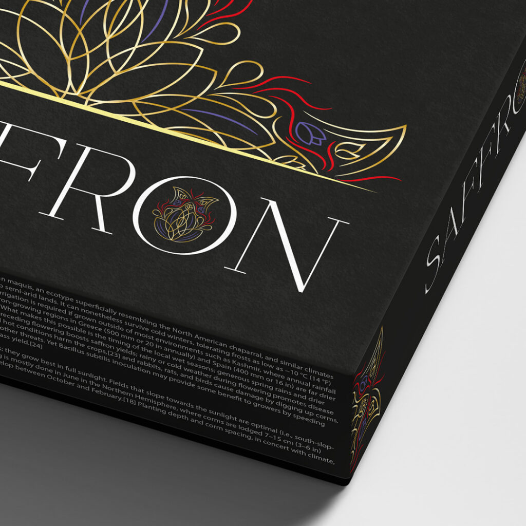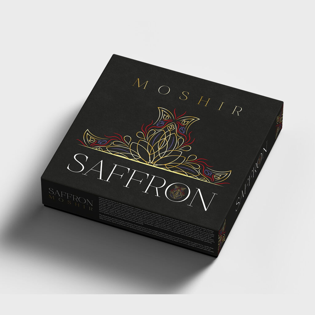 In the design of Moshir’s saffron export box, an attempt has been made to design a design away from the crowd and at the same time attractive inspired by the saffron flower (leaves, flag, etc.) geometrically in a different way and the texts are light, It should be classic and minimal, as well as the use of black color for the higher attractiveness of the geometric design and the better visibility of the saffron flower, which uses the colors of this plant to make it attractive to the audience. In order to convey the feeling of being old and luxurious of the product, after ideation and different studies, this study was finally approved.