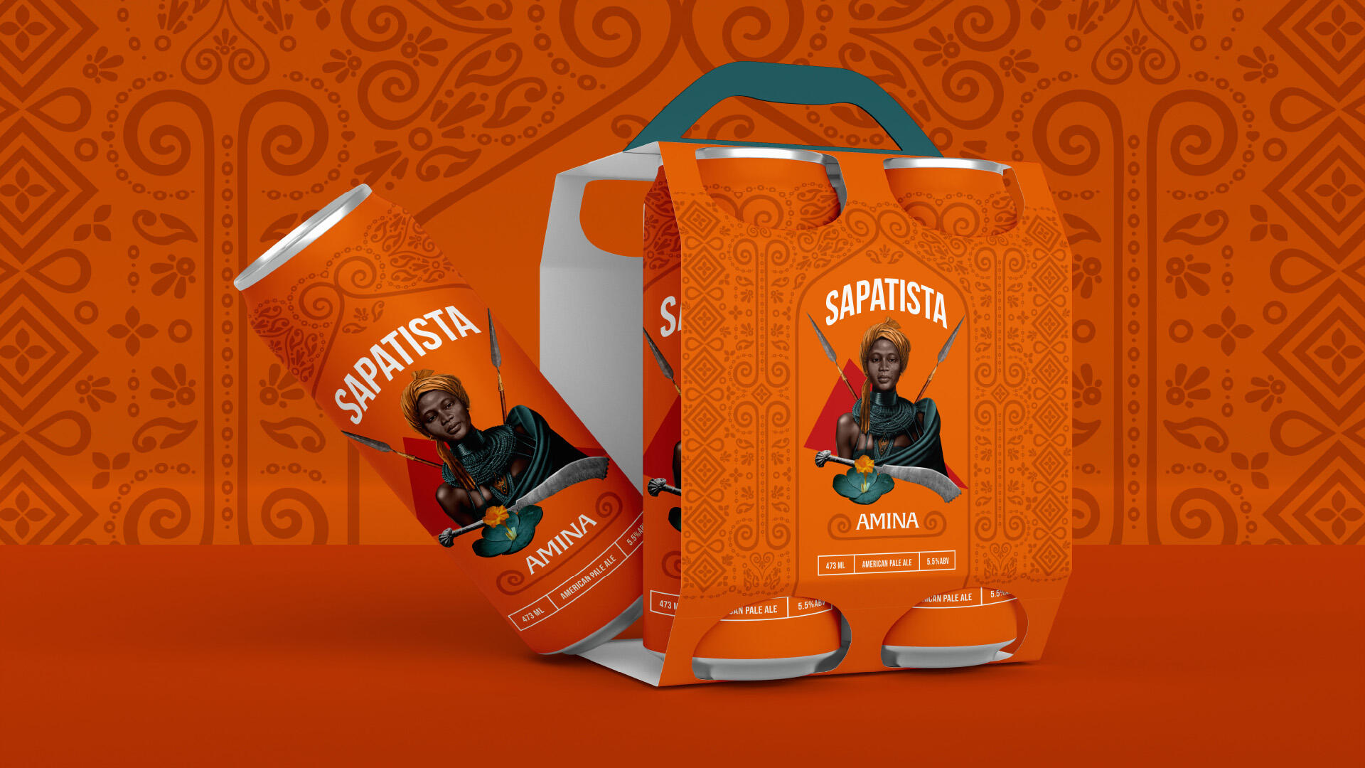 Soluction: The challenge of the project was to transmit all this strength and positioning of the Sapatista brand in its new American pale ale beer label. On the Sapatista Amina label, we pay homage to the African Queen Amina, a historical figure. We used an illustration that combines images, colors and graphics, forming one of the collage with images. As a result, an artistic and bold label was born that expresses the courage and heroism of Amina, the queen of Zazau.