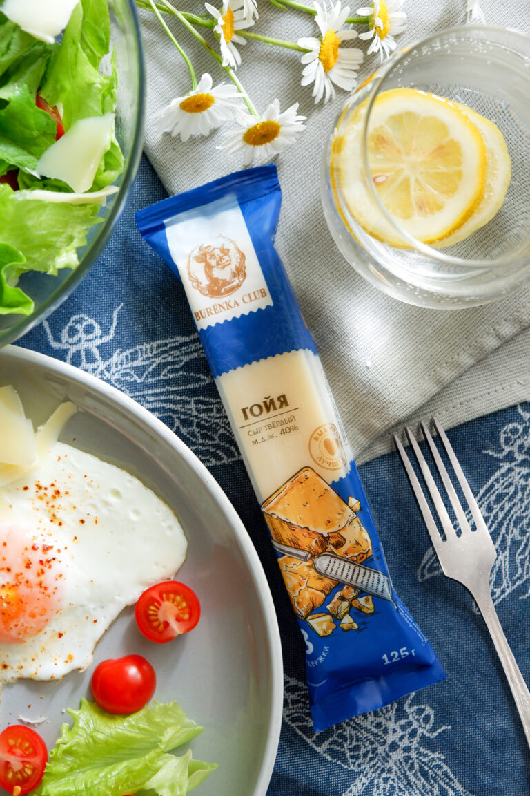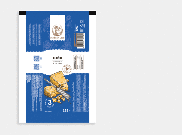 Cheeses are differentiated by the color of their packaging. A stylistic engraving was drawn for each cheese. The cheeses on the store shelf are in the same general line, in a show box.