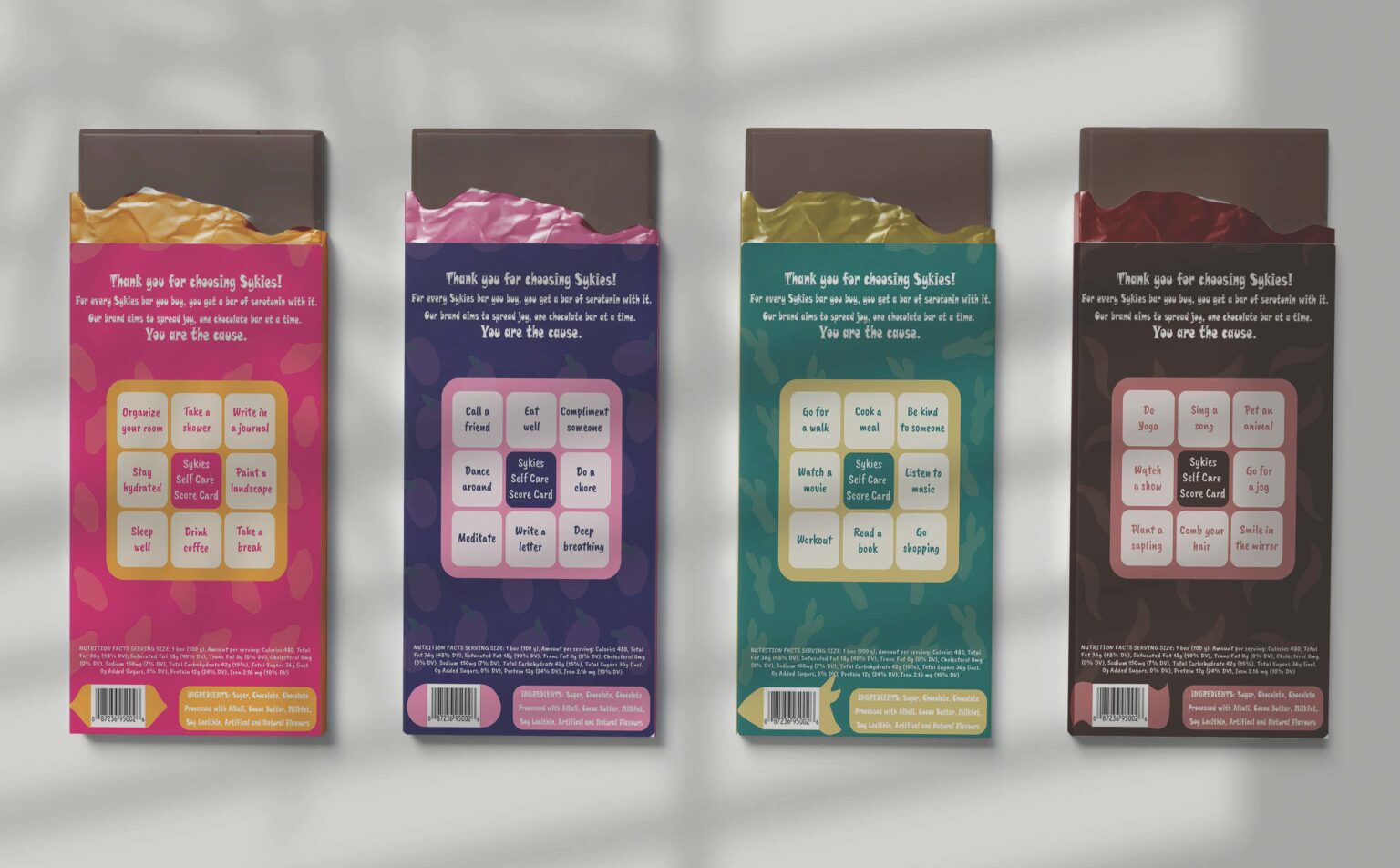 Sykies aims to provide healthy chocolate bars for snacking that uplifts your mood and puts you in a better headspace. Everyone deserves a self-care chocolate bar, Sykies bars are affordable, accessible and available in mass merchandiser stores. For every Sykies bar you buy, you get a bar of serotonin. You are the cause.