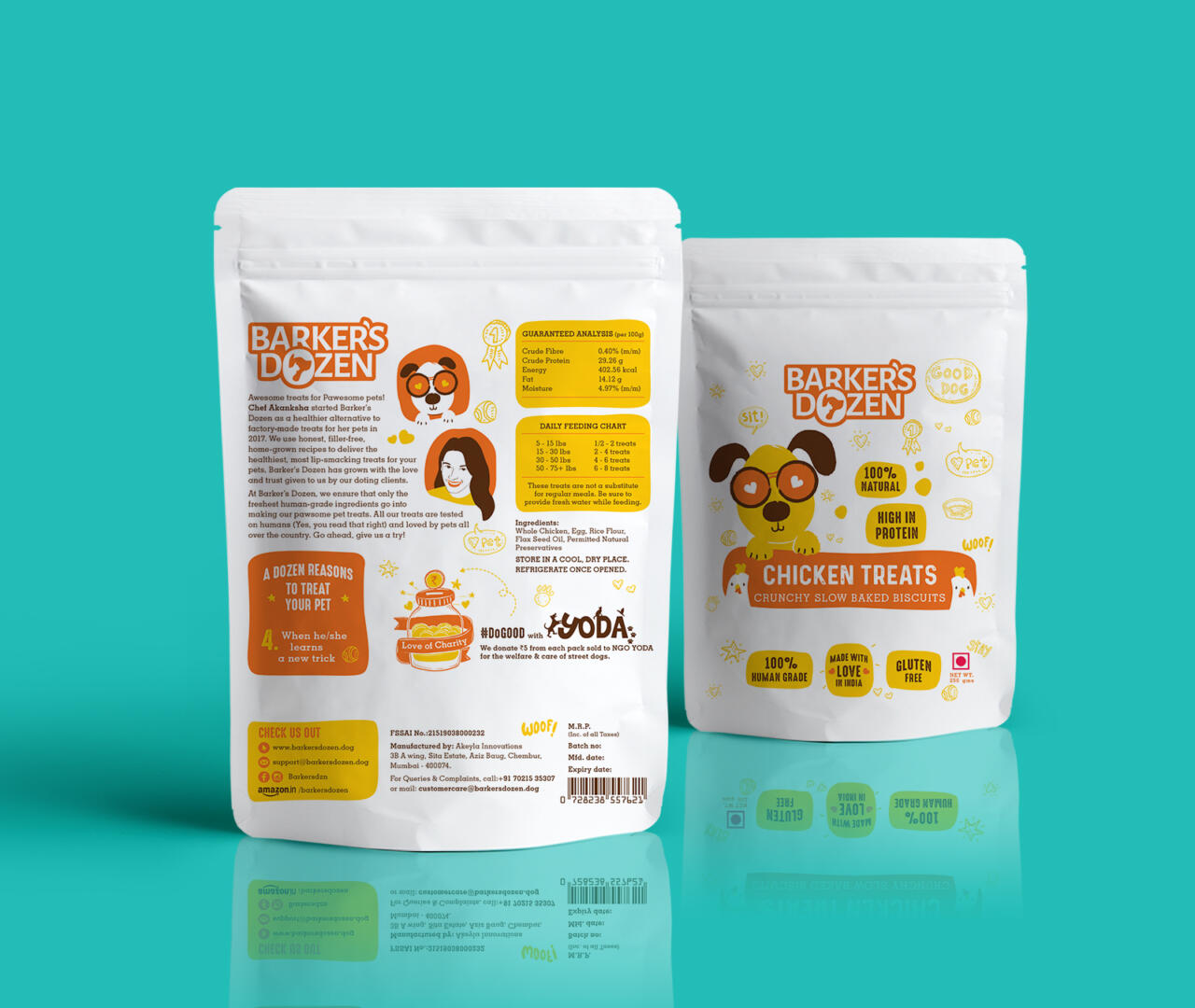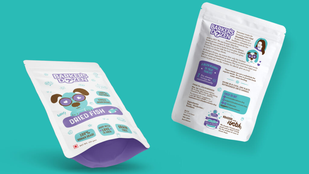 Our packaging featured the lovable mascot donning the heart goggles, iconography depicting the ingredient of the treat and health benefits highlighted in a playful layout. The back of each pack showcases a unique reason to pamper beloved pets. Along with a ‘dozen reasons to treat your pet’, we thoughtfully illustrated the founder’s caricature—a heartfelt tribute to the visionary behind Barker’s Dozen to give a personal touch. Making use of the packaging to the fullest, a social initiative started by the brand was highlighted as well.