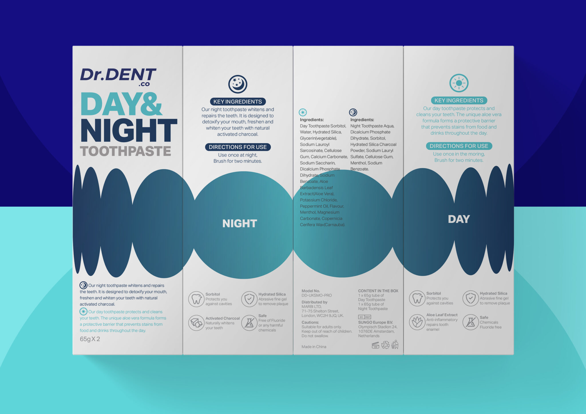 The packaging idea is inspired by the alternation of the sun and moon. A simple and modern visual layout with an abstract row of teeth conveys dental health care day and night. In addition to reflecting the professionalism and innovation of the brand, it also helps to build consumer trust.