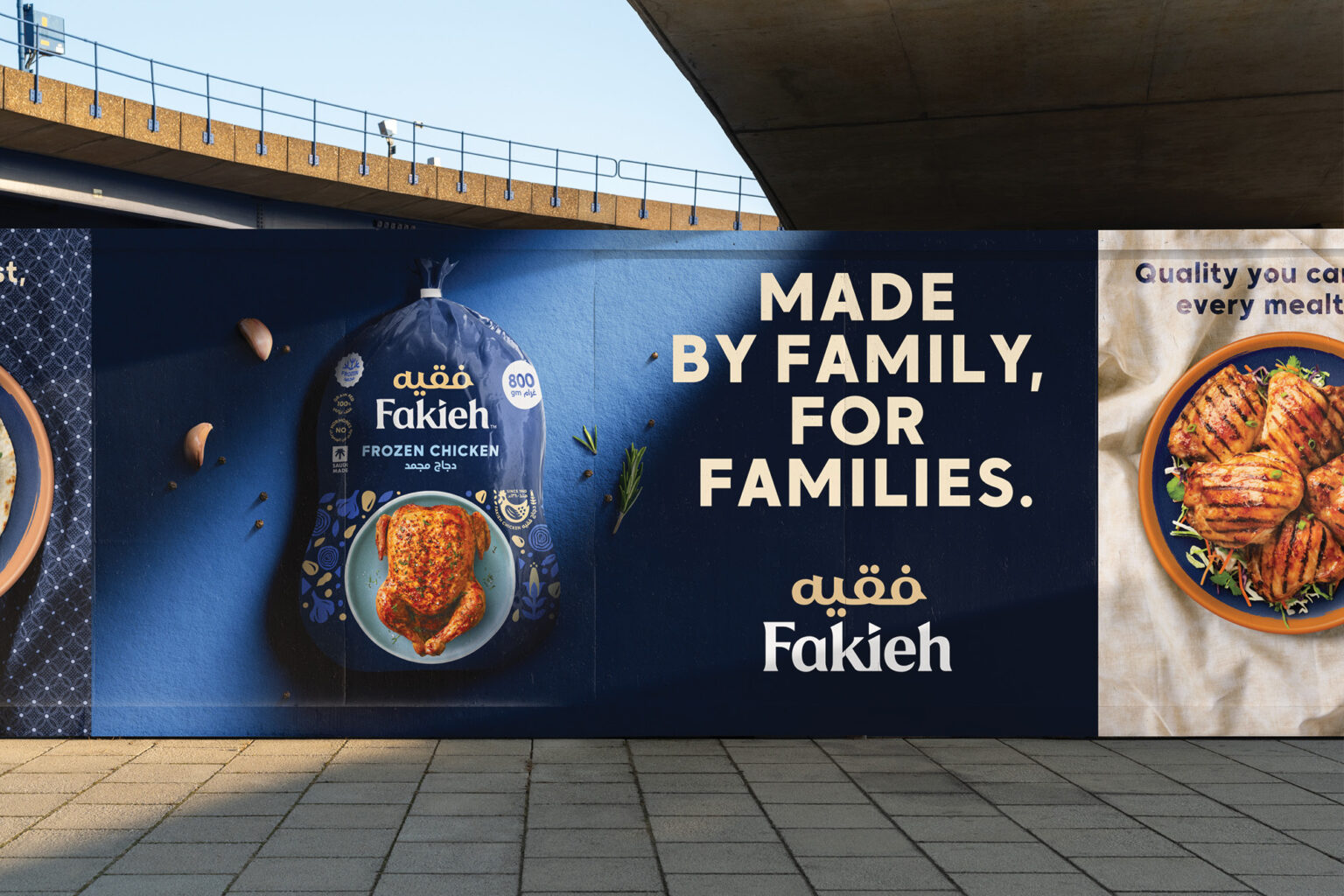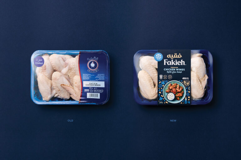 We saw Fakieh as a well-loved heritage brand with a product range for the modern Saudi family. A genuine ‘modern traditional’ brand. We drew inspiration for the rebrand from the country’s rich and iconic cultural arts and crafts movements. The brand wordmark was radically redesigned – working with two typographers to develop a bespoke lockup. A traditional, soft serif reflects the pride, trust, empathy and compassion that a consumer sees in the brand. The Arabic translation position and colour intended to be a ‘crown’ device on top of the wordmark. Moving away from the cold and impersonal white livery, a rich dark blue inspired by historical paintings and a favoured architectural colour for doors and window framing unifies the brand across all formats. A unique pattern was created using intricate patterns found on mats and rugs rather than geometric patterns. The grain to feed the chickens and food ingredients make up the pattern used in various ways to frame food and messaging. Taking pride of place within this pattern is the Fakieh heritage device. Flexibility was built into all new brand elements to allow for ease of use across various packaging and communication touchpoints.