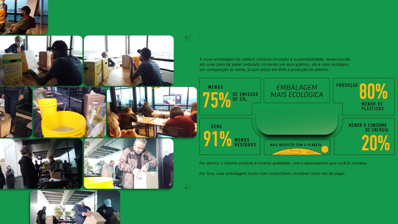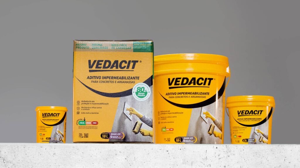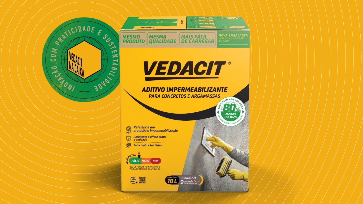 Innovating means successfully exploring new ideas. Disruption is an expected consequence of a well-executed, innovative process. A risk inherent to a business that proposes to be innovative is having to face decisions that directly affect its essence. And Vedacit’s bag-in-box is one of those decisions. Handling the Yellow Bucket, a brand asset that carries with it the identity of more than 85 years of tradition and success, is the most symbolic embodiment of the growing innovative process that Vedacit values so much as a strategic business pillar. The commitment to sustainability defines this new packaging option, whose system we named Vedacit na Caixa, as simpler and more objective, as Bag in Box is a very technical name for the world of civil construction.
