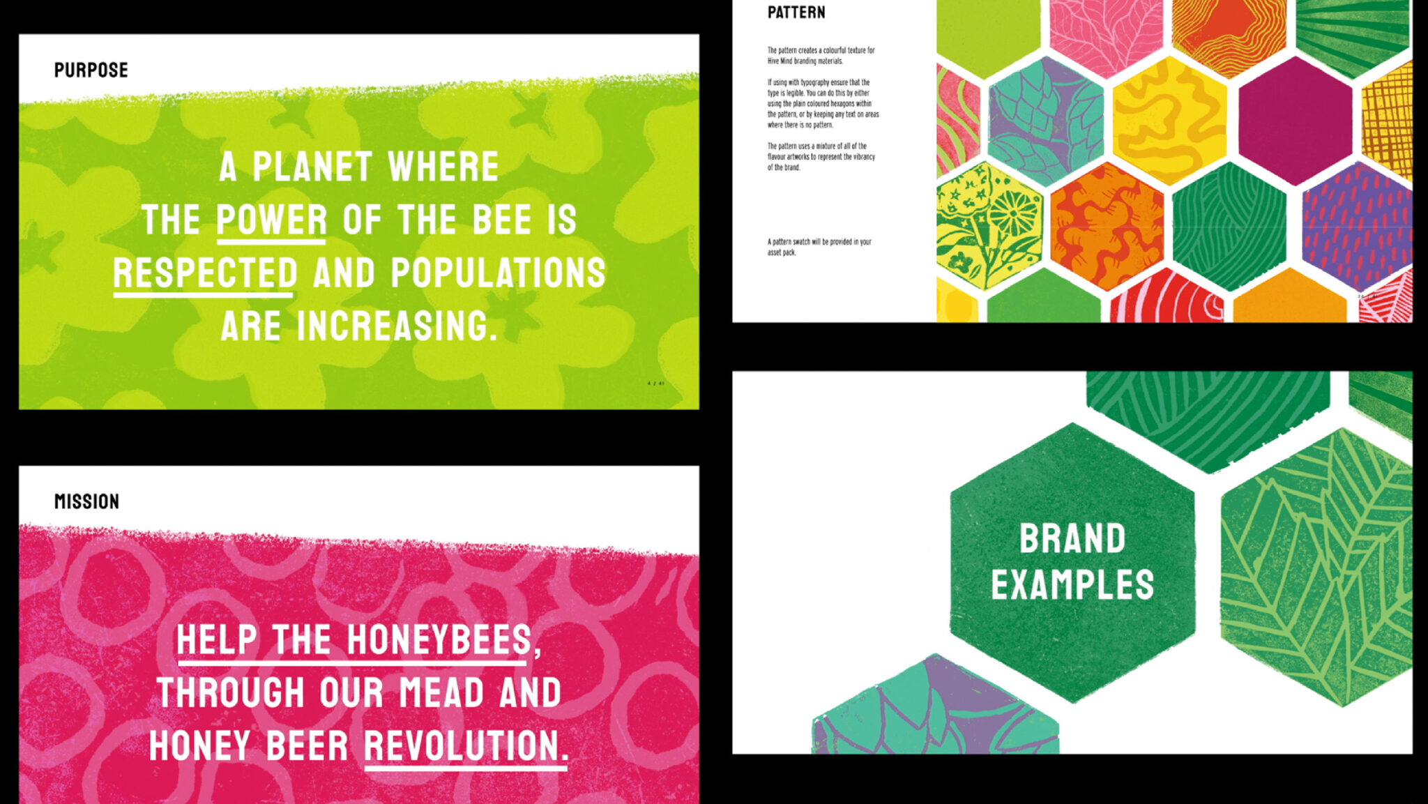 Recreated digitally, the individual linocut hexagons created energetic patterns representing the natural world, bees and the ingredients in the drinks. These became core assets for the brand world, appearing on packaging as well as off-pack.