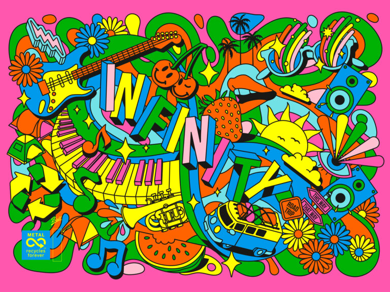 BALL Corporation are a global aluminium beverage can manufacturer. They produce innovative packaging to elevate brands and to help them engage consumers. I was approached to create an illustration that would be vibrant, colorful, and increase awareness of the infinite recyclability of aluminium and also utilise the special effect Day-Glo inks for my illustration.