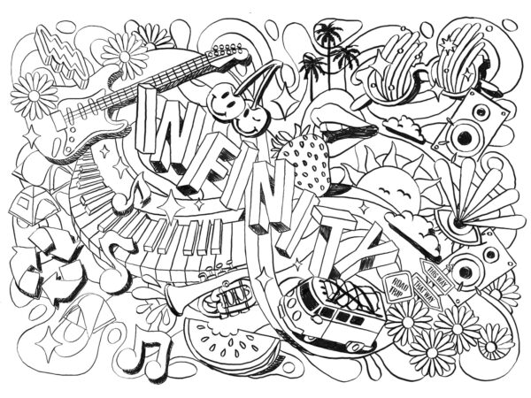 The themes of my illustration wrap around an infinity symbol hidden within the illustration – it creates both a “road” for the road trip and also creates a path through the themes. I’ve included images in my illustration to reflect fun and socialising at festivals, with musical instruments, festival tents and vibrant images to create an impactful vibe. A festival camper van drives through the illustration with fun roadsigns and scenic imagery. Fruits are dotted throughout to imply Summer beverage flavors. I’ve used vivid, Summery colors to create lots of energy – the green and yellow are printed in special Day-Glo inks to make the cans stand out.