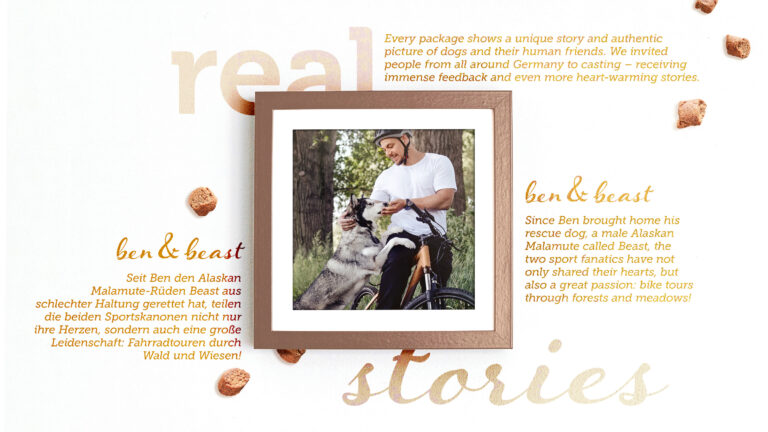 Ever wondered about the names of the dogs on our packaging? Or if the people pictured would buy the product themselves? We’ve brought authenticity to the forefront, featuring real individuals, and offering you a chance to learn more about them. pure sensitive goes beyond being a mere pet food; it becomes a cross-media ambassador of our brand’s new core values: “mera. Understand. Care. Love.”, with a focus on the relationship between humans and animals. This creates a proper neuro-boost analogous to the wow-effect: where other brands might simply sell dog food, at pure sensitive transparency and authenticity are not only portrayed but demonstrated.