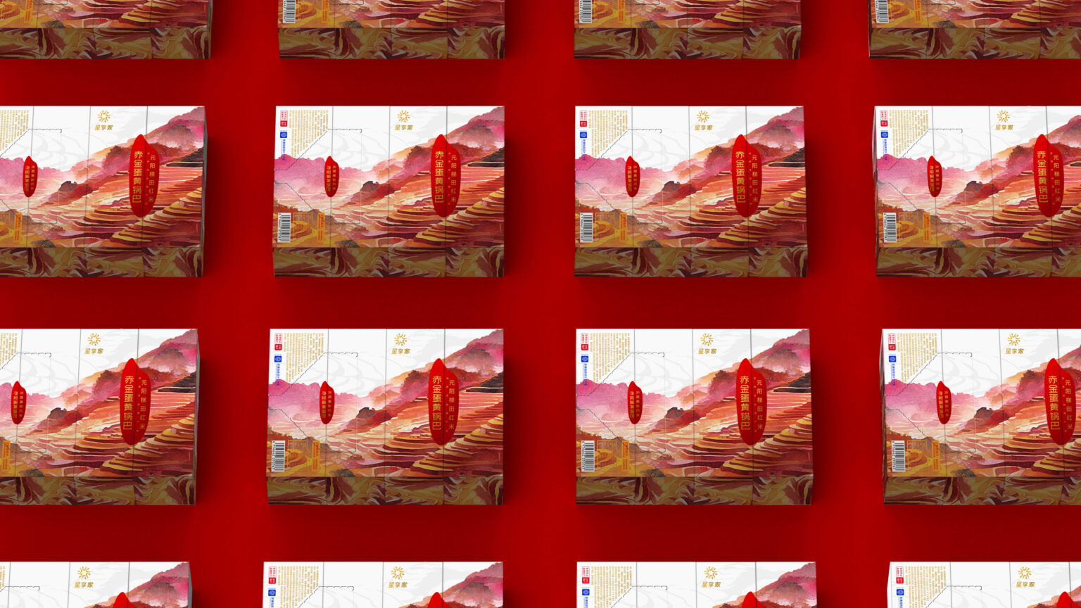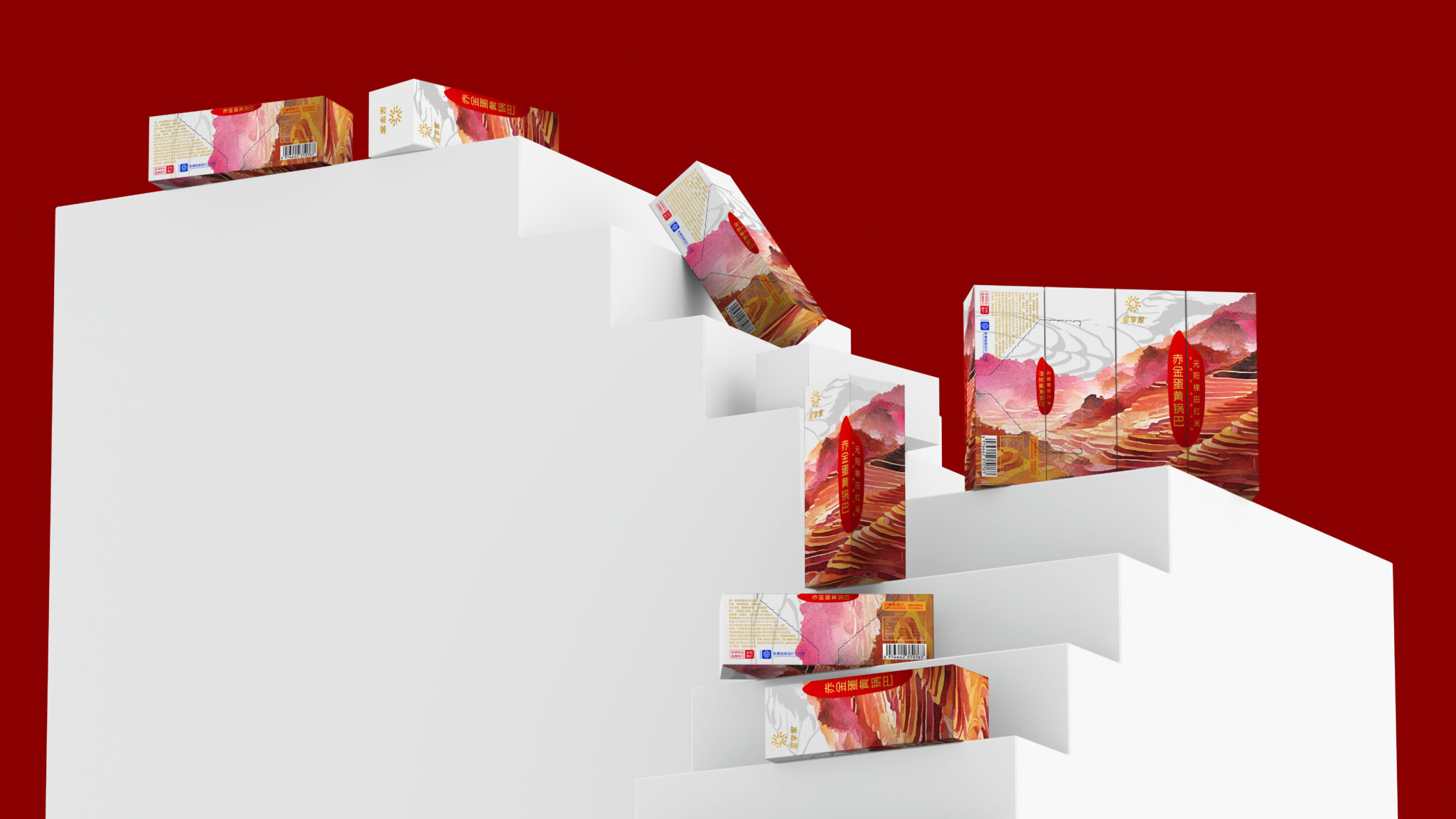 The design is based on the illustration of Yuanyang red rice terraces, and this color visual language reflects the purity of primitive agriculture, high-quality products as the foundation, and sales promotion as the source of rural revitalization. The first impression is to attract consumers. Combined with the online AI painting platform Midjournal, the designer inputs keywords to generate this original Yuanyang terraced field with an artistic sense, highlighting the emotional value of the “beauty of origin” of the red gold egg yolk pot. Known as one of the “Top Ten Most Beautiful Terraces in the World”, its geographical value has been recognized by consumers. The next step is to break through the psychological level and generate an order demand. Its red rice shape further highlights its identity, creating a visual psychological suggestion of “product formula”. Design a tearable seal on the packaging structure for easy opening and storage.