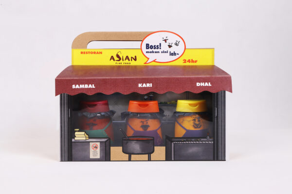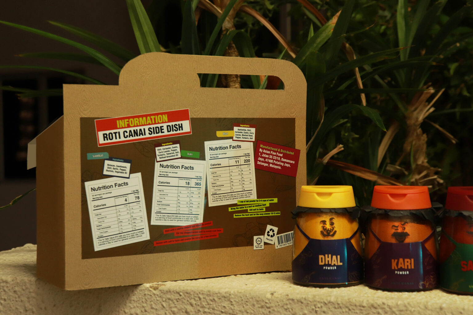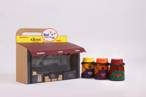 The inner packaging design embodies the Indian kitchen’s emotions and flavors, with mascots in aprons radiating authenticity. Contemporary design and dynamic typography capture the vibrancy, enhancing the restaurant experience. The outer packaging, reflecting Indian culture, welcomes all with a cheerful bubble-talk signboard as product labeling. Inside, illustrations of bustling scenes pay homage to the Indian restaurant, while essential information ensures transparency.