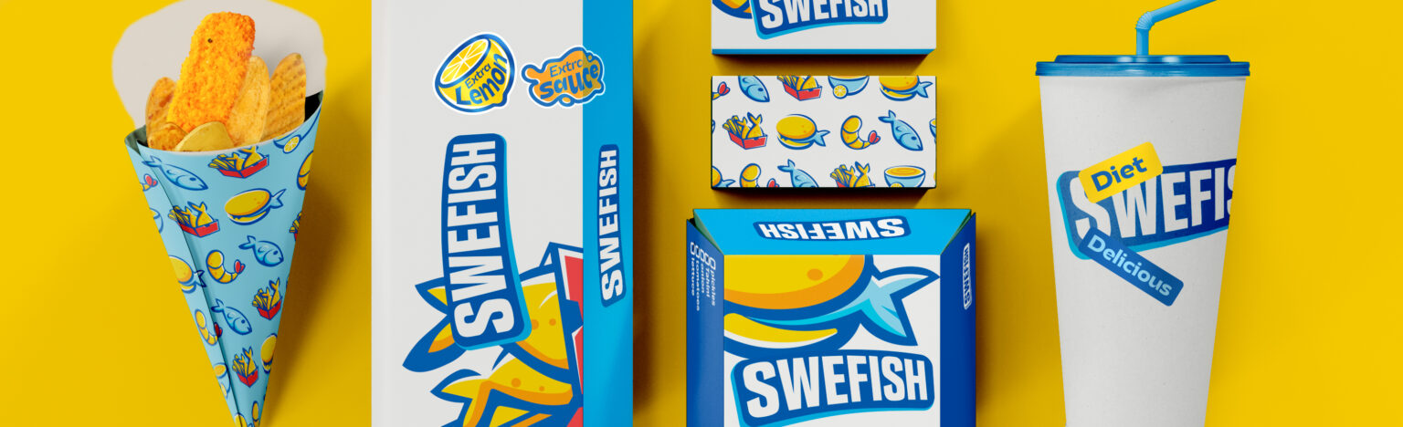 The shapes and drawings of the brand were influenced by menu items in order to create a visual connection between the brand and the consumer. To make the brand appear friendlier and more welcoming to both adults and children, dynamic cartoonish graphics were created, enticing them to try swefish.