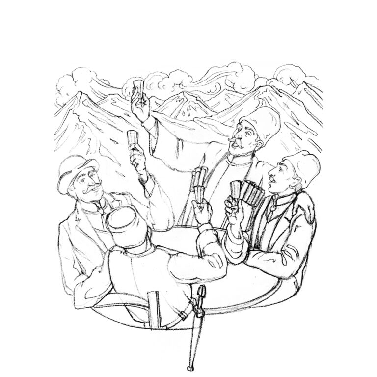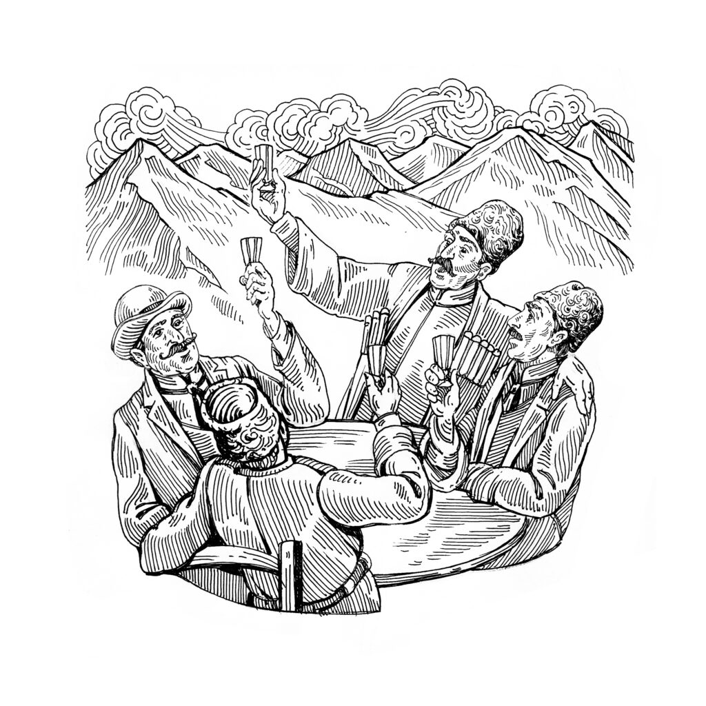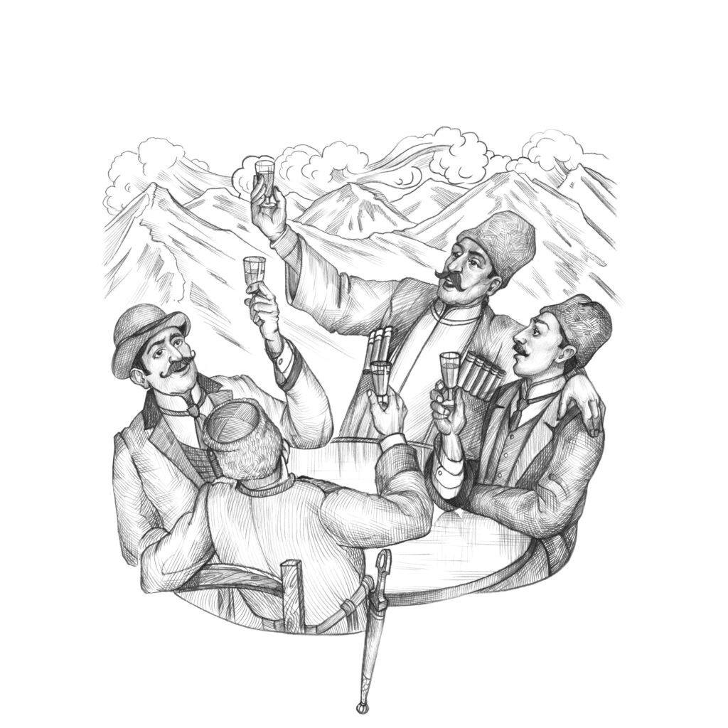 This idea was accepted immediately though it was quite difficult to choose the composition itself. Neither was the consensus on how the scene should look. One idea was that the feast scene should be in the form of a frame around the name of the drink, the second idea assumed the creation of a main character and a feast scene in the background but I had the third idea. It was somewhat simpler so I thought about a feast scene at a round table where one of the characters was proposing a toast in a typical local manner.