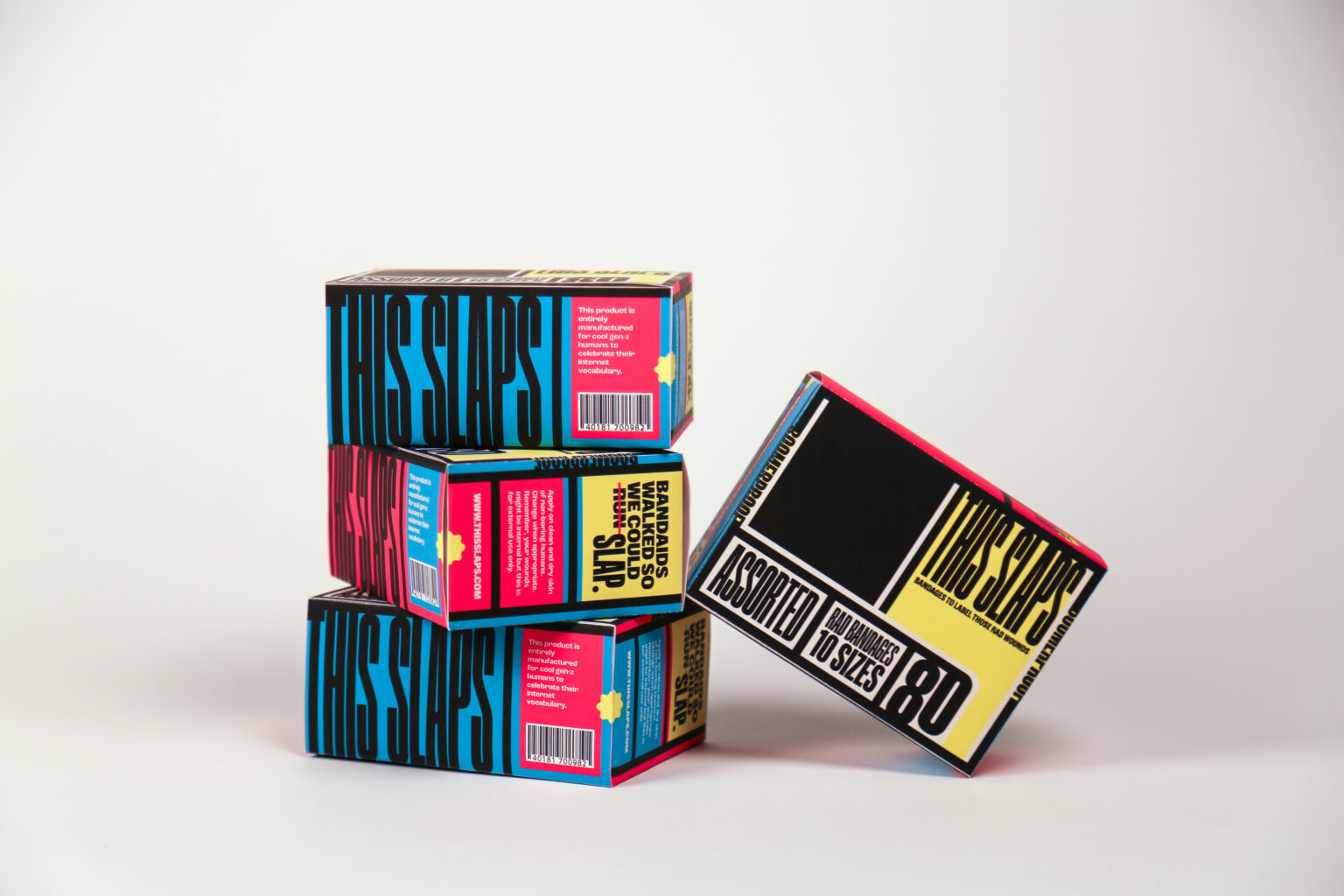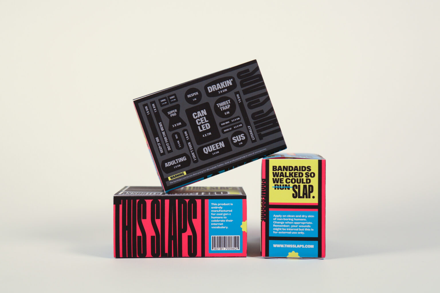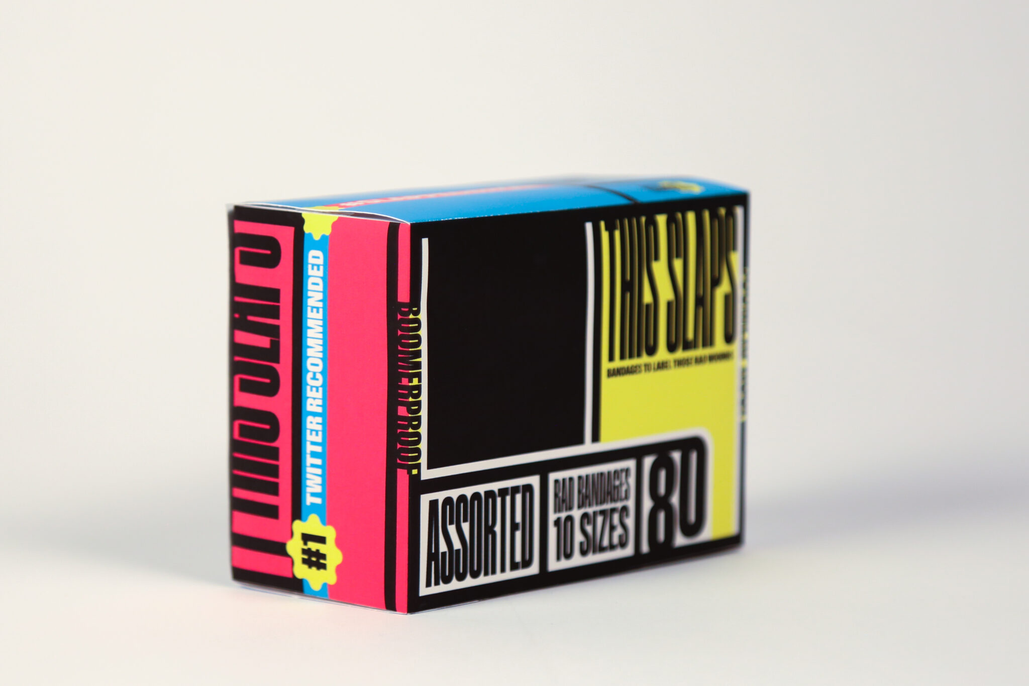 This packaging design project was developed for a fictional brand, This Slaps, that reimagines bandages inspired by Gen-Z labels on Social Media. The brand highlights the potential of marketing medical bandages as collectibles specifically to the Gen-Zs, exploring the outlandish comparison between Twitter hashtag labels slapped on everything and bandages, on physical wounds.