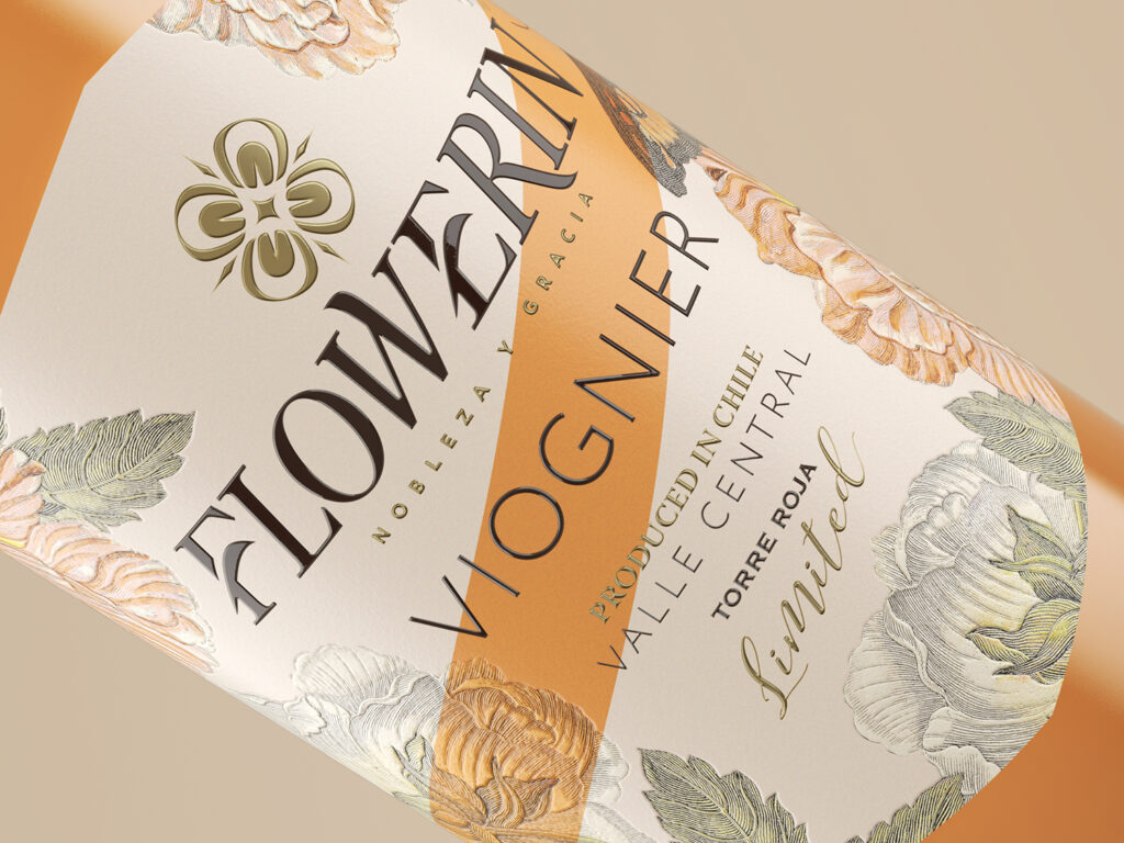 The overall calm and balanced composition of the label is broken by a bold diagonal stripe that serves as an identifier for the grape variety and gives the label design freshness, relevance and a bit of dynamism. Graphic illustrations of flowers and butterflies frame the type block, create a special sophisticated atmosphere and symbolize the richness of the taste of the drink, created with passion and passion for their work.