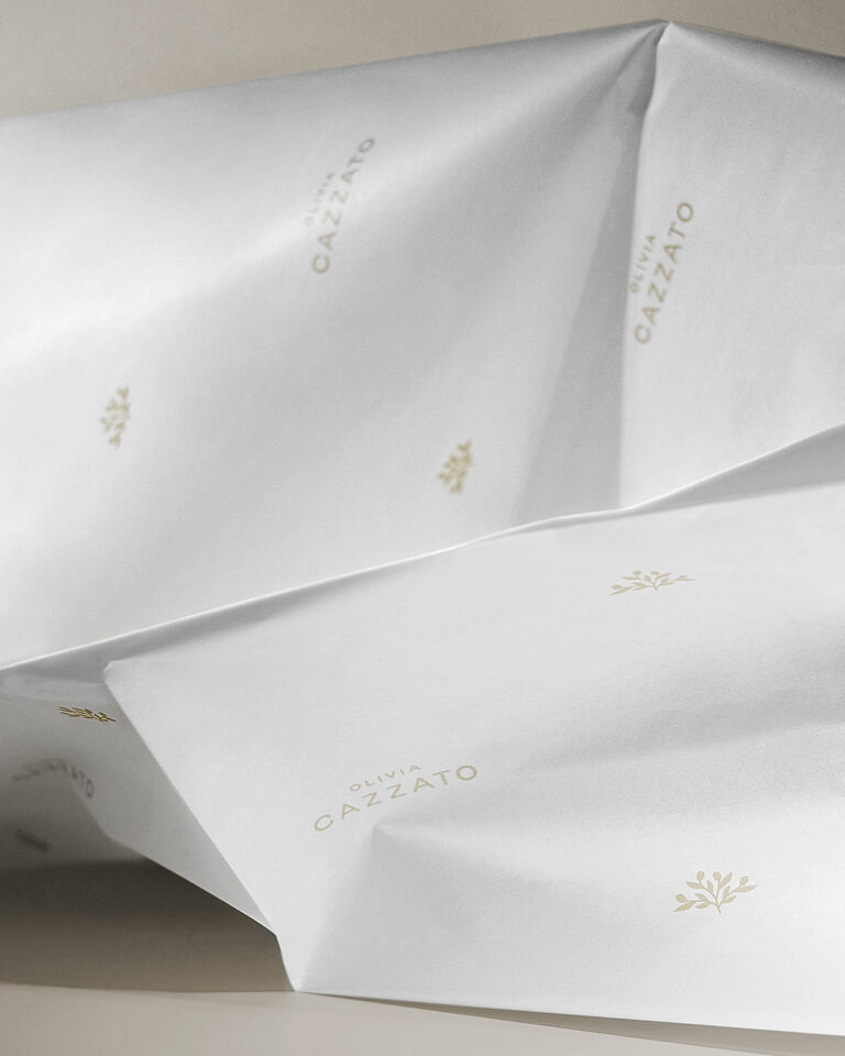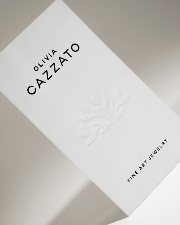 Logo, packaging, print + web design for goldsmith Olivia Cazzato. Since Olivia is from Italy and her jewelry is strongly inspired by Italian design, this should also be reflected in the design. Three minimalist logos were created for her. A figurative mark in the shape of an olive tree to reference Olivia’s roots, and a word mark that can be used in combination.