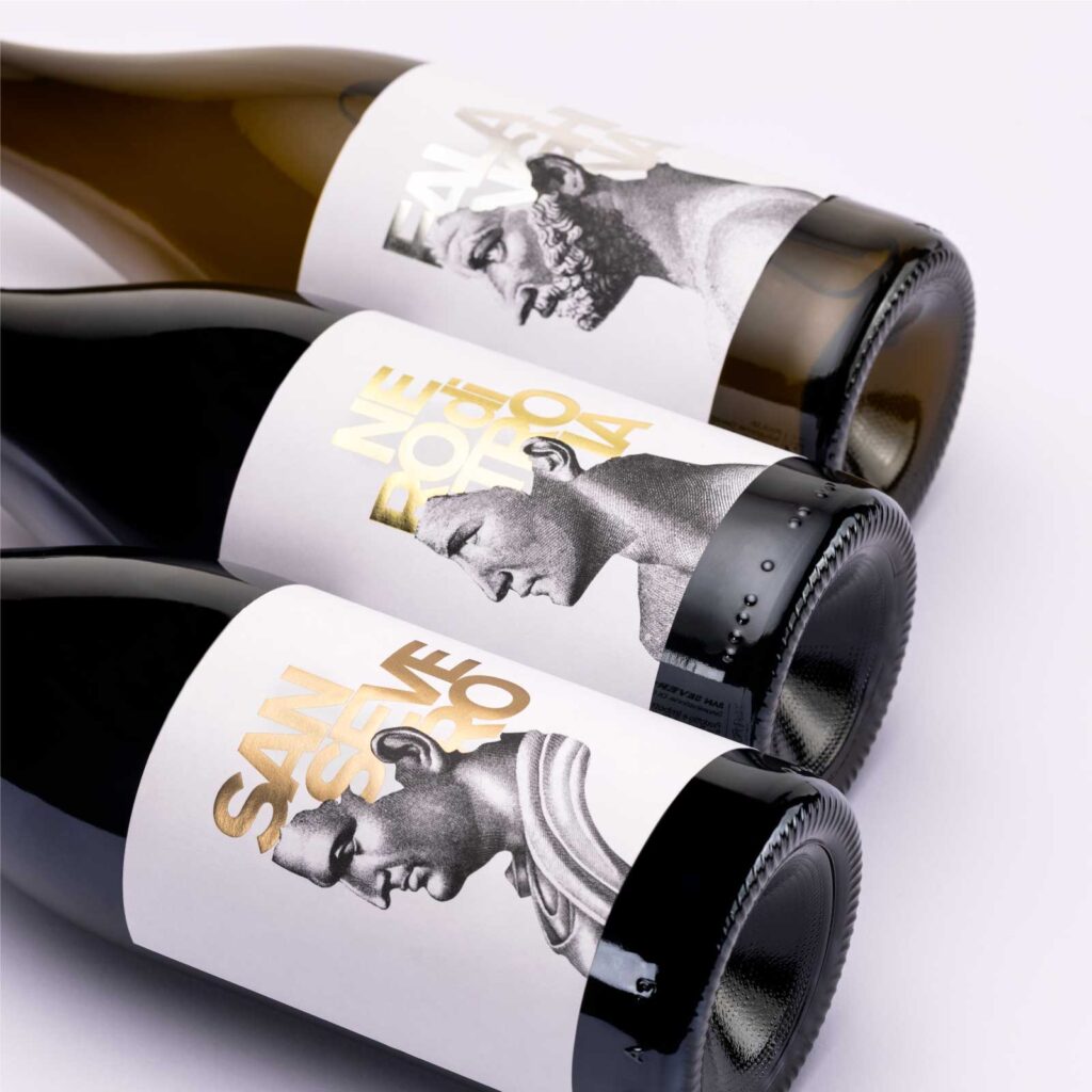 The rebranding simplified the brand signs through the use of the ancient Trajan font, consistent with the renewed positioning. The engravings of the emperors’ half-busts become protagonists on the bottles and are enhanced through a play of different full and empty spaces according to each line of wines. The use of metal foils helps to give preciousness to the labels.