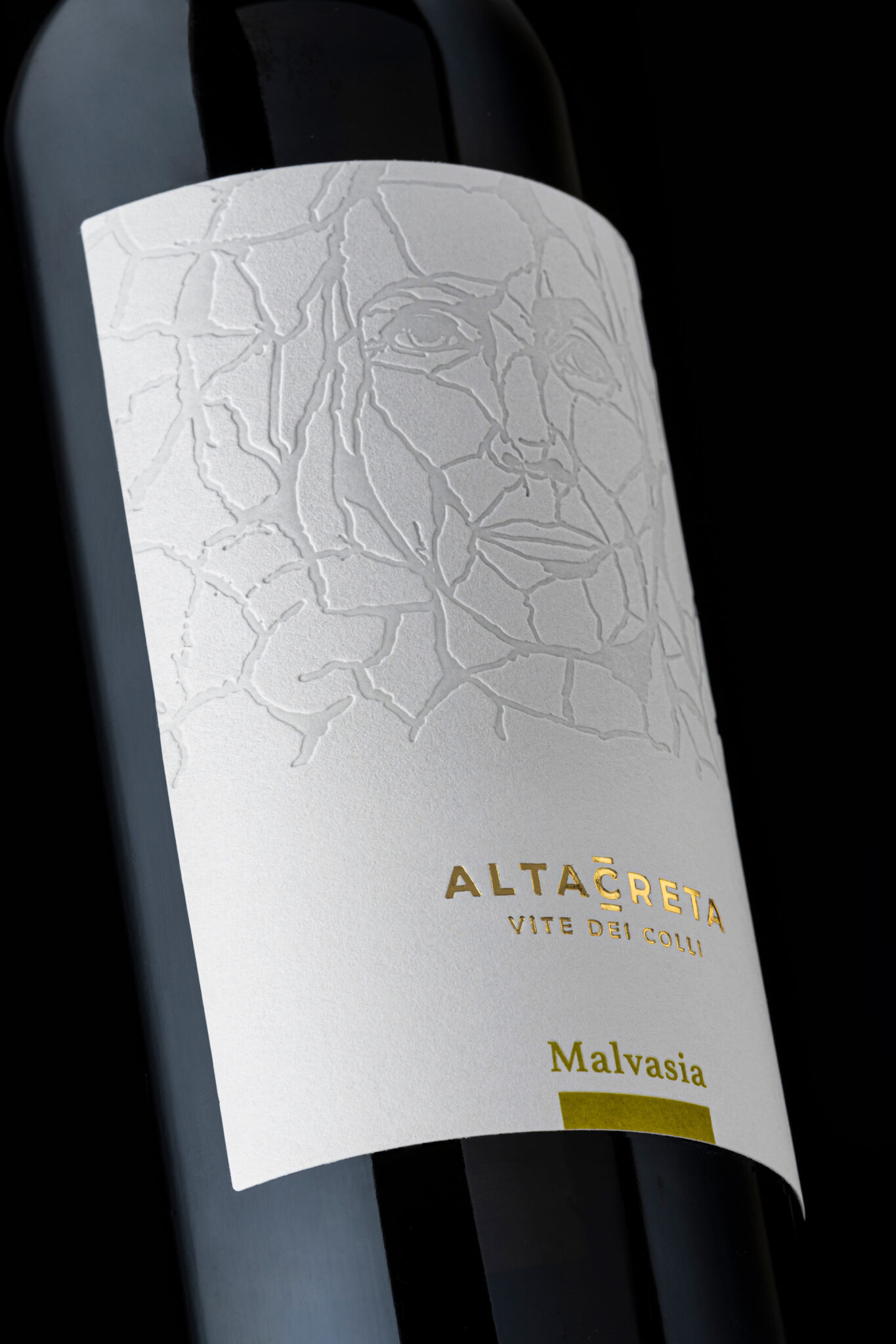The land where this wine is born is famous for the presence of clay. The project merged the texture of the land into a single idea which, with its lines, also draws the faces of men and women who work the land. With the use of negative space, a face and the texture of the ground are seen at the same time. Printed on Fedrigoni Moonlight paper to emphasize the effect of the cracks in the ground.