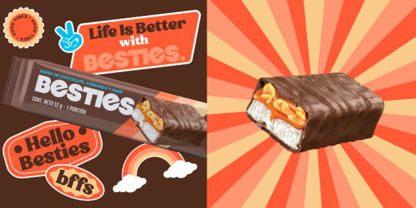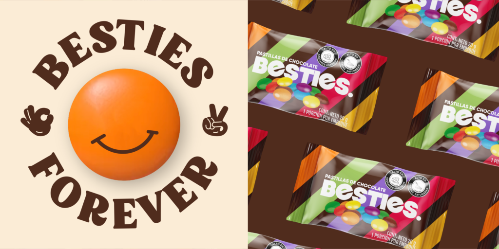 The “Besties Forever” campaign copy constructs a nostalgic universe using retro fonts and childhood-inspired graphics.