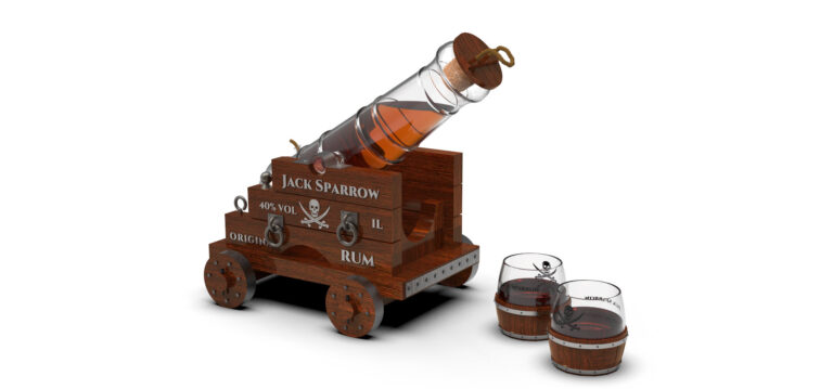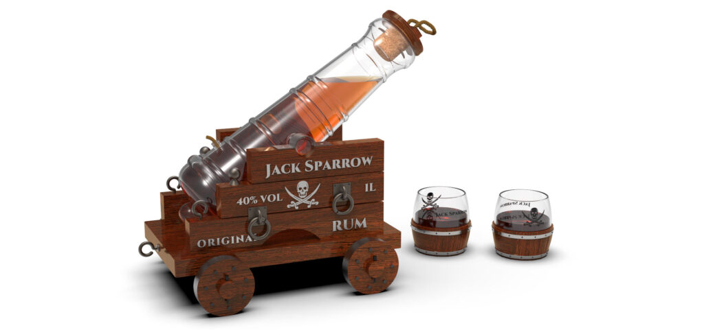 Jack Sparrow Original Rum Concept is inspired from the Movie Sequels “Pirates of The Caribbean”, The design looks very simple yet it took lot of work to make it dynamically realistic. From calculating the volume of liquid (rum) in the canon, to finding the right pivot point to hold it without freely flipping and be able to tilt the bottle and empty it without tilting the cart or cradle.