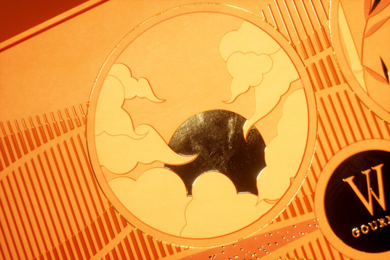 As you progress from left to right, you’ll be enchanted by four dreamy scenes. There’s the serene morning with drifting clouds, the tranquil noon with golden leaves falling in the breeze, the romantic sunset embracing the flight of birds, and the sparkling evening illuminated by radiant lanterns. To add depth to the overall effect and create a sense of motion, each detail, from the clouds to the wind-blown trees and lanterns, has been meticulously embossed, providing a realistic and dynamic touch. The gold foil accents enhance the uniqueness of the Autumn painting with their captivating shimmer. Beyond the striking outer box, the interior of the gift set is carefully crafted with luxurious velvet fabric. The combination of deep blue and warm orange creates a sophisticated contrast that elevates the design.