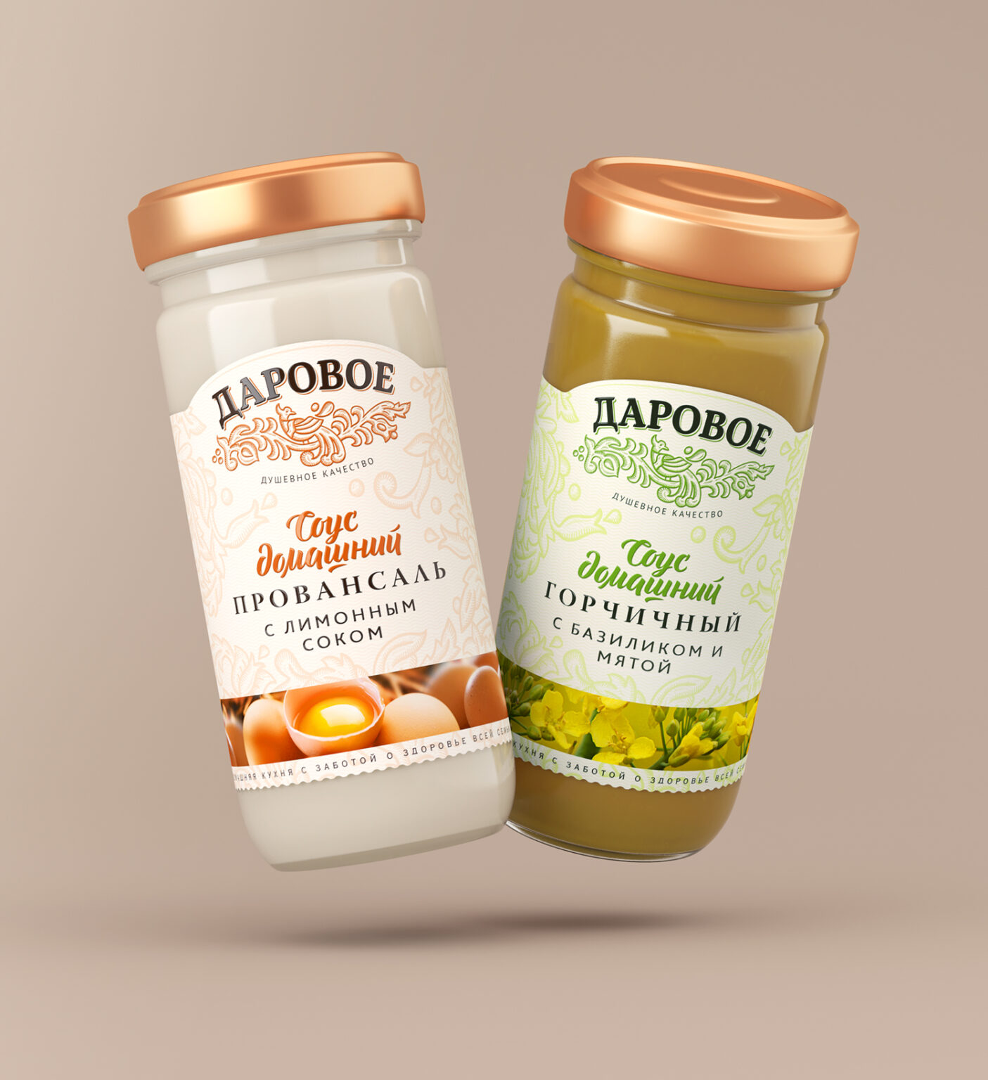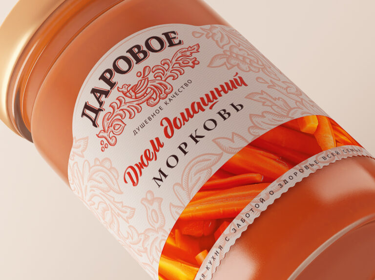 The concept of label of canned food “Даровое” refers to Russian traditions and crafts, embodying the image of a delicious homemade meal. The design of labels for jam, jam, sauce and honey is filled with the warmth of the house, expressed in traditional ornament. Bright colors on a light background are designed to create a positive image and highlight each specific product in the lineup. For the differentiation of tastes, fragmentary photographs associated with the color range of the label are applied, which gives the package its integrity and attractiveness.