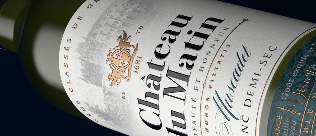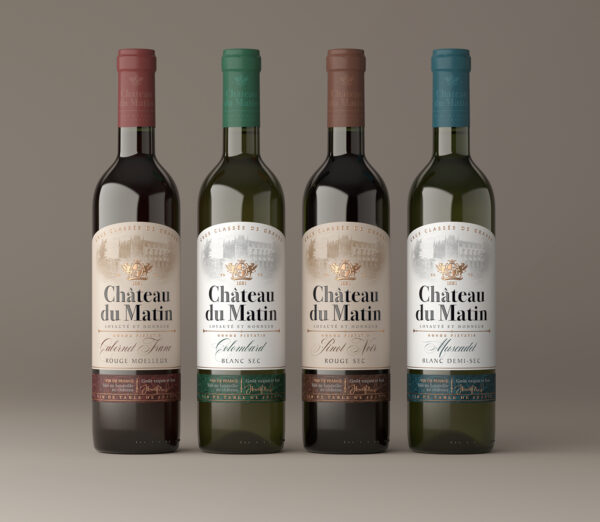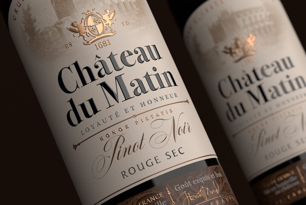 The label for «Château du Matin» white and rosé wines is designed in a calm classic style. The main space was chosen in white with barely visible engraving and a strict central composition of the elements. It goes well with a small bottom label for additional information. A darker background with a Gothic pattern helps to identify each type of drink, such a move has great potential for developing label design in case of expansion of the product line. An expressive accent in the design is created with the help of a font, an elegant calligraphic drawing, which typed the names of grape varieties, and a logo stylized as an old coat of arms.