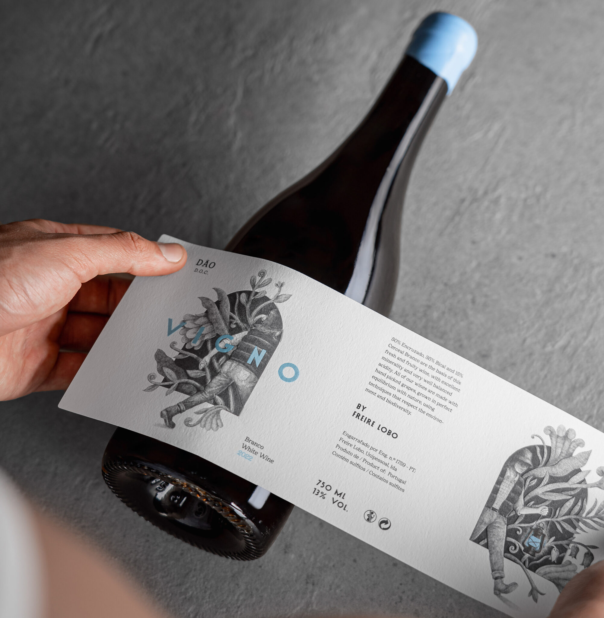 As you gaze at the label, we invite you to observe an opening, a magical passage to the world of Dão. The vegetation peeking through this gap represents the deep connection to the land, hard work, and authenticity that this wine embodies.