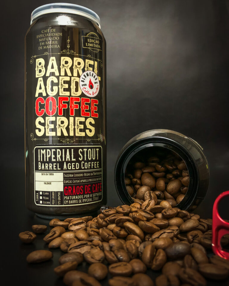 As a highlight on the front, we have the name of the special series, “Barrel Aged Coffee Series,” with “Coffee” highlighted in red for better product category visibility at the point of sale. In a second glance, just below the first, there is a label where variable information is placed according to the type of coffee in the can (IMPERIAL STOUT or BARLEY WINE), following font standards.