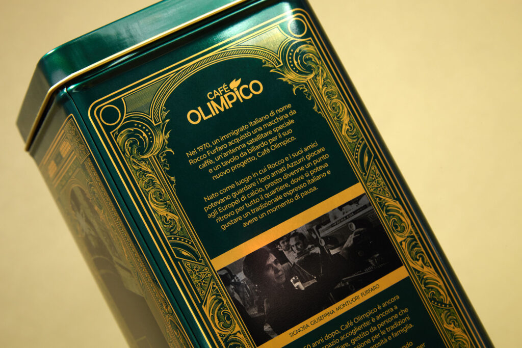 One of our favourite projects to date, the Limited edition Café Olimpico Heritage Tin is a nod to the traditional Vintage Style Italian Coffee tins that are found in every Nonna’s Kitchen Shelf. A testament to Italian design, craft and attention to detail. This Tin not only is an exceptional work of art, but every single inch of the tin is crafted based on existing details within Olimpico. From the ornamental ceilings to the engravings in the wood seen around the café.