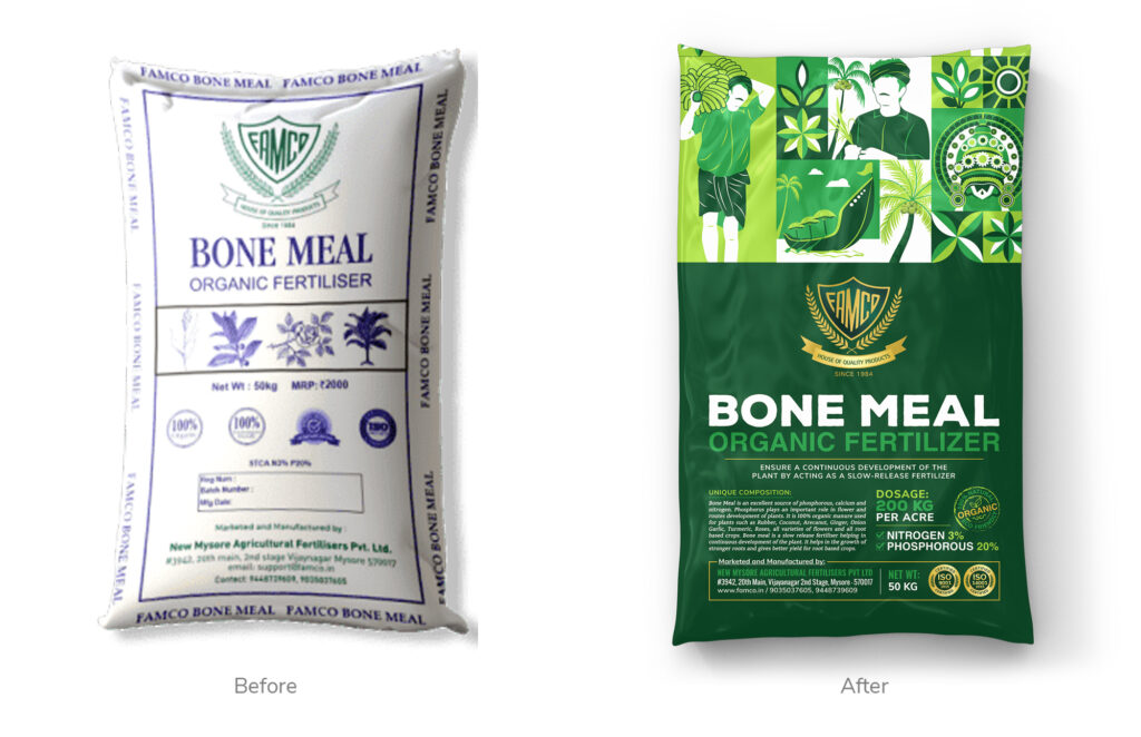 The client asked for a Modern and Appealing Design for his fertilizer Bag, instead of the old design, which looks low-cost product. Bone Meal is usually used by farmers for crops like coconut, Arecanut, ginger, rubber, rose, flowers and all plantation crops.