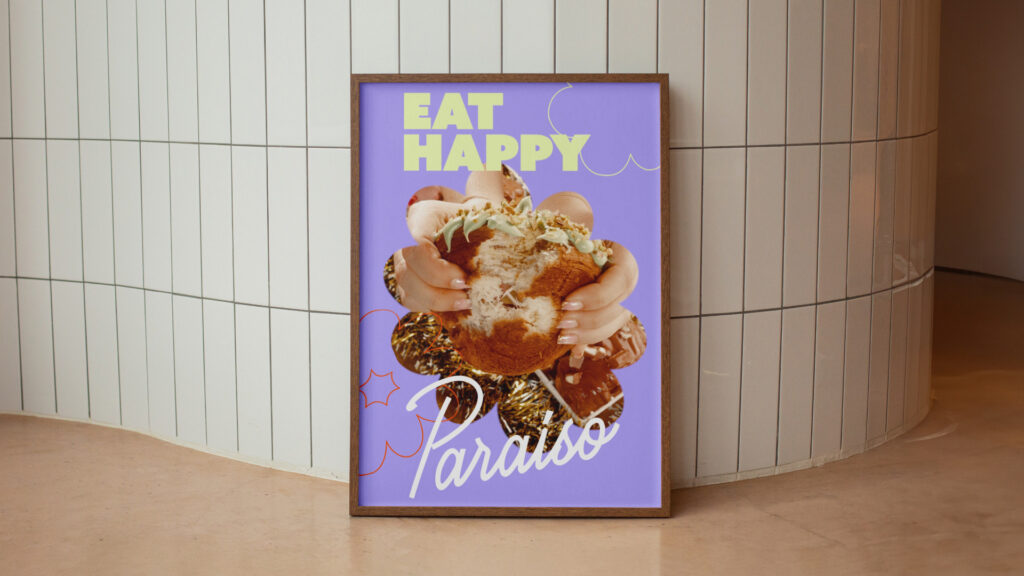 The carefully chosen color palette is a symphony of pastel hues, including enchanting lilac, soft cotton candy pink, and delicate pastel yellow. These colors collectively evoke the sensation of basking in an earthly paradise, where delight knows no bounds. To accentuate the brand’s character and spirit, we employ catchy phrases that mirror the very essence of Paraíso. Phrases such as “Say Cheese,” “Too Munch,” “Eat Happy,” “So Chill,” “So Sweet,” and “Just Bite It” reverberate as the echoes of the unique Paraíso experience. These enchanting expressions not only draw in new patrons but also etch a sweet and enduring memory in their hearts.