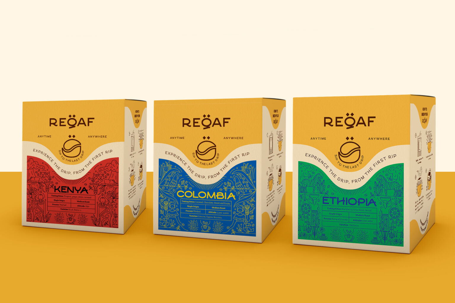 Drawing inspiration from the concept of drip bag coffee, the packaging design of “ReQaf” is visually captivating. The bags are thoughtfully designed to be placed inside a cup, with handles hanging on the side, allowing for effortless preparation and an elevated coffee-drinking experience. Each pack showcases a distinctive coffee blend and flavor sourced from different countries, presented in an illustrative minimal style that embodies the brand’s commitment to simplicity and excellence. Prepare to embark on a sensory journey with “ReQaf” as it redefines your coffee experience.