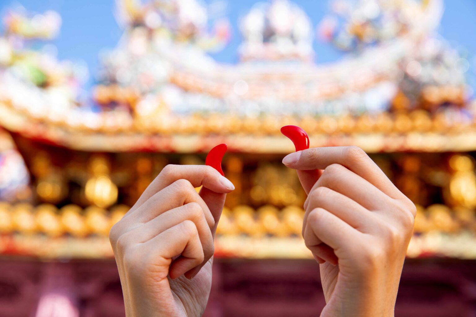 Divination Blocks 擲筊 (“筊” pronounced like “Cup” in Minnan): After introducing oneself, one asks a question to the deity and throws the divination blocks. The state in which they land indicates whether the deity is willing to grant the wish.