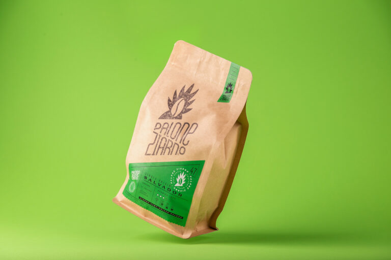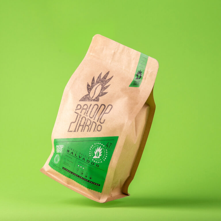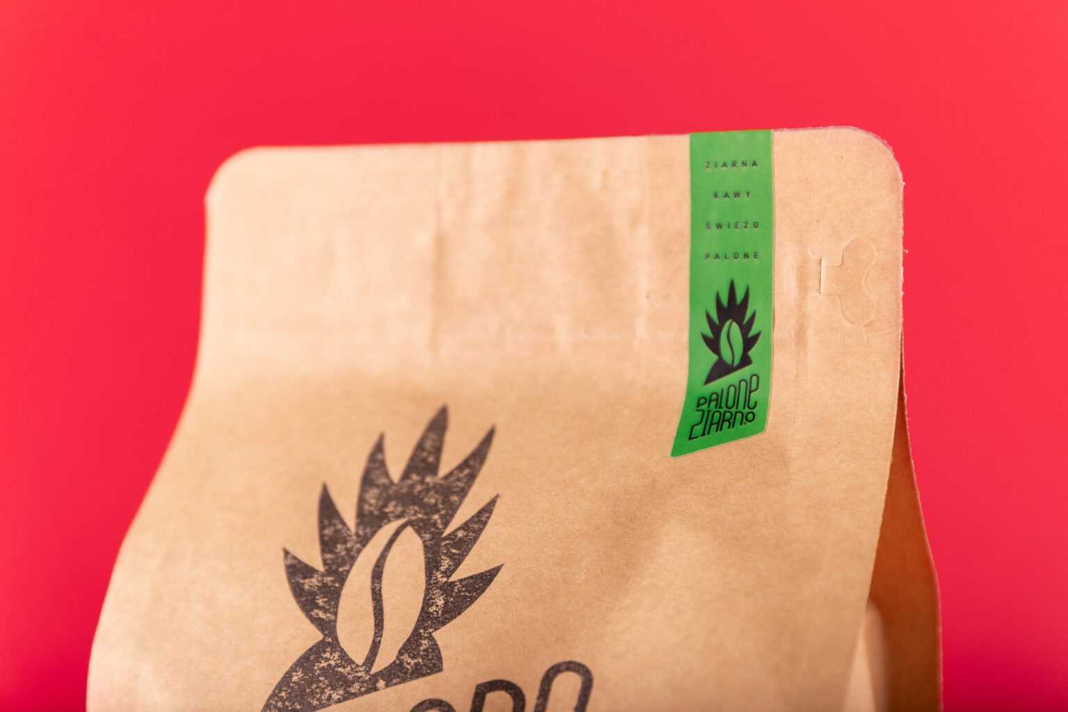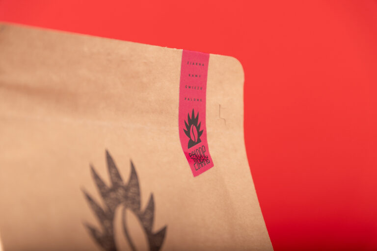 With the many different blends we have, we went for a bright and vibrant color for each of them. Since coffee bags are quite large, we could allow for prominent branding. Each of the bags was stamped with a unique stamp with the company logo, dipped in paint, and came out to be unrepeatable for every piece of packaging, keeping the rugged and irregular finish. Apart from that, every bag also has a tiny piece of paper with the logo on top, which seals the packaging.