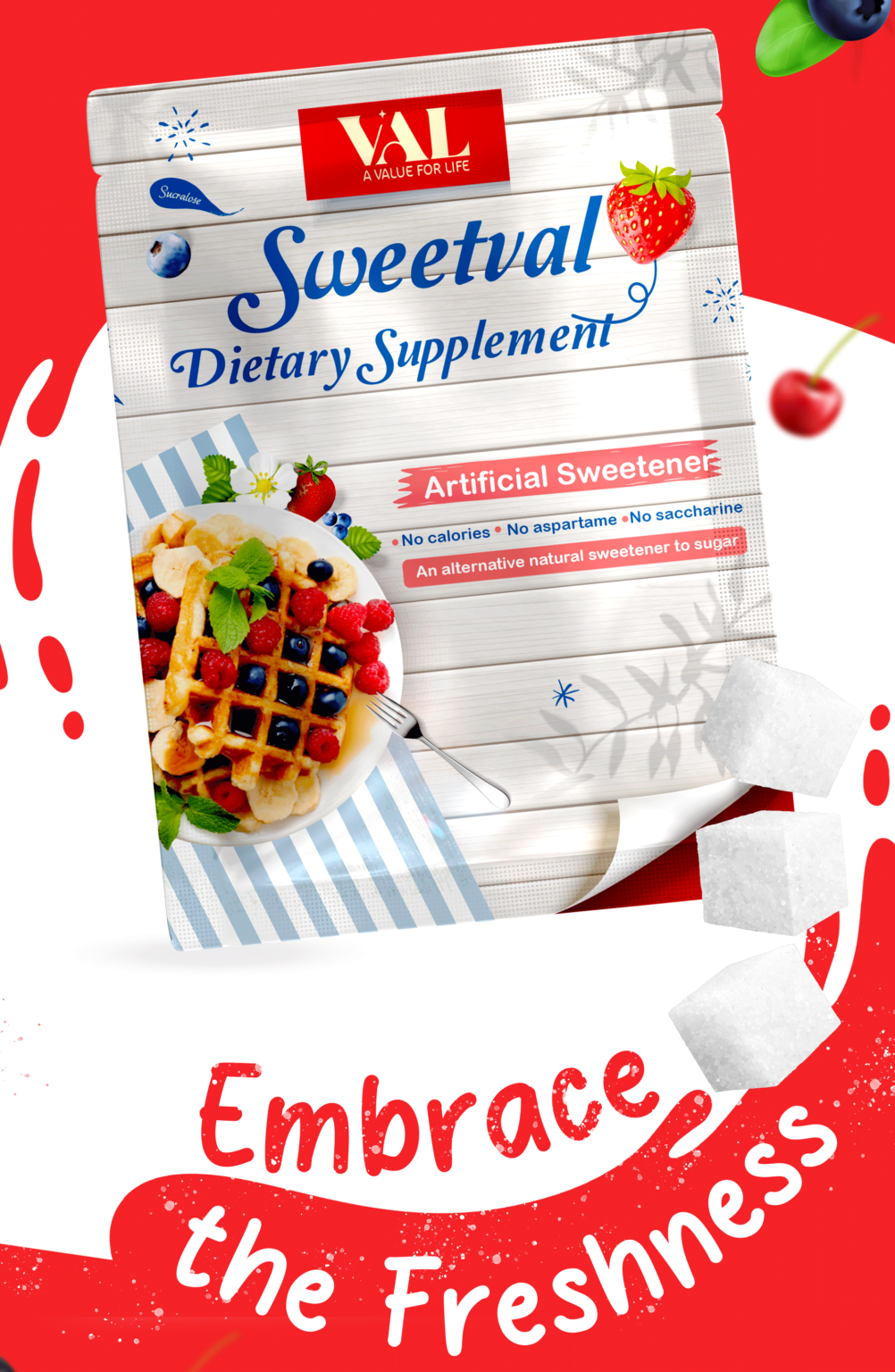 Our packaging is a celebration of energy and freshness. Energetic colors dance across the design, creating a visual symphony that mirrors the lively spirit of Sweetval. The sleek sachets are not just convenient; they’re a statement—a promise of a delightful and healthier sweetness.