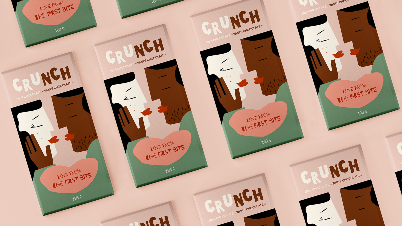 This is a love story but from the first bite. Crunch is a chocolate brand with half milk chocolate and the other half white chocolate, created for young couples. The branding needed to convey romance and tenderness in order to attract the target audience.